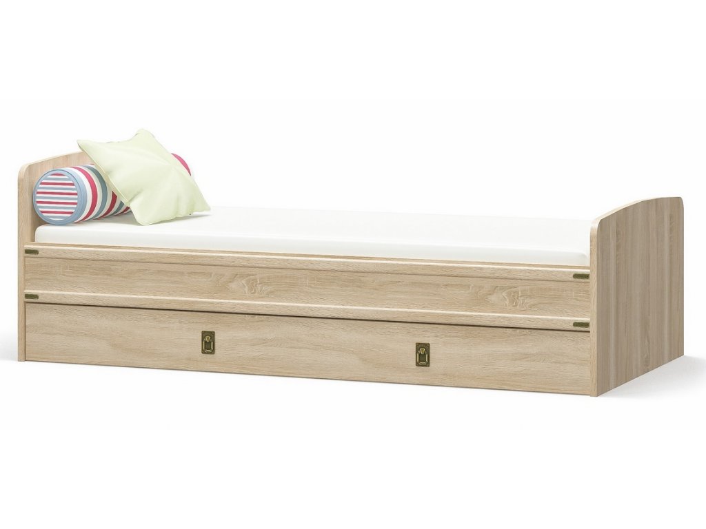 Postel s úložným prostorem ze sektorového nábytku v moderním provedení. Postel je vyrobena z kvalitní LTD desky v barvě dub sonoma. Součástí postele není rošt a matrace, ty je třeba doobjednat. Doporučený rozměr 90 x 200 cm. Pod postelí najdete zásuvku, která Vám poskytne velký úložný prostor. Dodáváme v demontovaném stavu.Doplňkové parametry