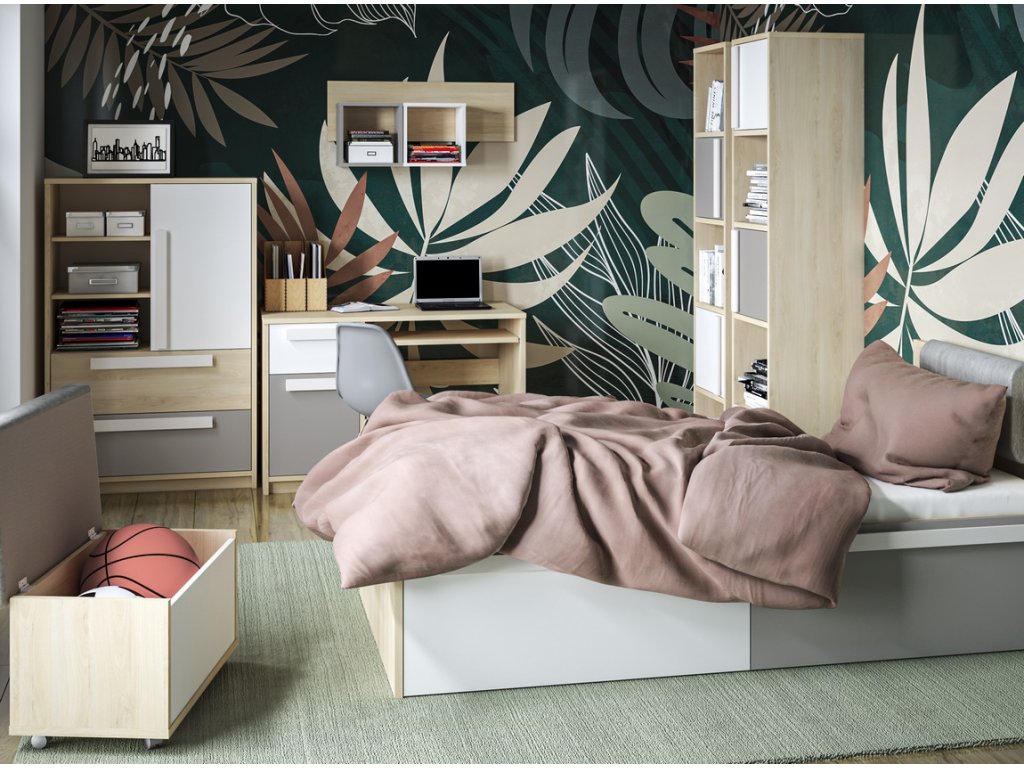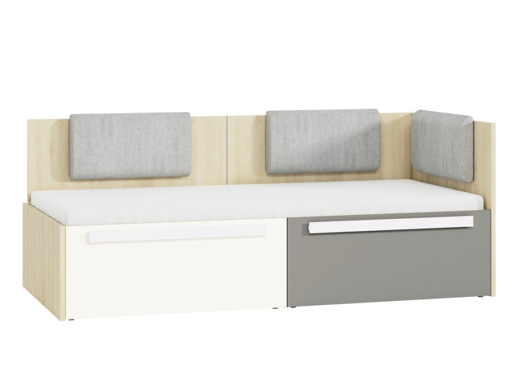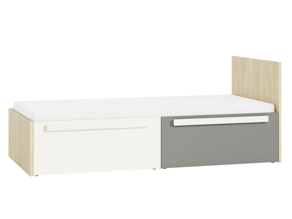 Postel s úložným prostorem moderního vzhledu. Čelo postele je možné namontovat na pravou nebo levou stranu. Korpus je vyroben z kvalitní desky LTD hraněné ABS páskou v barvě buk fjord, zásuvky jsou vyrobeny z desky LTD v kombinaci barev bílá/šedá. Úchyty jsou dřevěné bílé. Výška roštu je cca 30 cm od země. Matrace není součástí postele, je nutné ji dokoupit zvlášť. Doporučený rozměr matrace je 90 x 200 cm. Rozměry úložného prostoru - 2x (91x74x16 cm - Š x H x V). K posteli je možné dokoupit praktické další boční zástěny a k nim také čalouněné opěrky. Dodáváme v demontovaném stavu.Doplňkové parametry