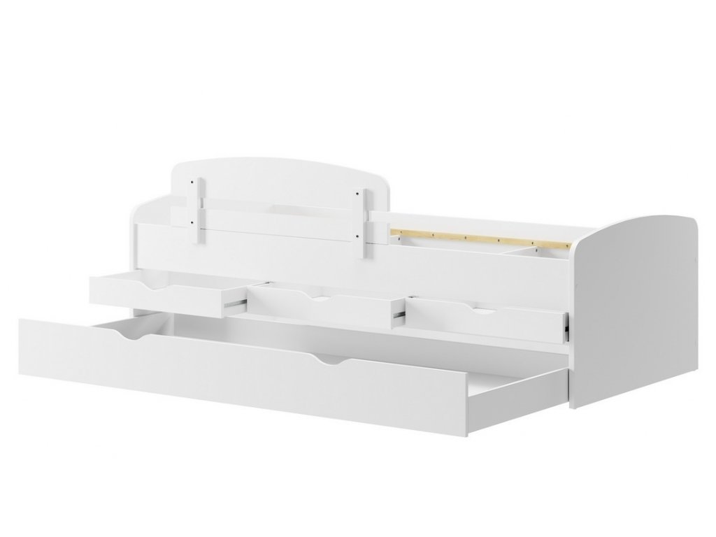 Postel 90x200 cm se třemi zásuvkami. Postel je vyrobena z kvalitní LTD desky v barvě bílá mat. Pod třemi zásuvkami je další jedna velká zásuvka, kterou je možné využít jako úložný prostor, nebo po vložení matrace jako další prostor ke spaní. Doporučujeme dokoupit bariéru k posteli, ta není v ceně. Dodáváme v demontovaném stavu.Doplňkové parametry