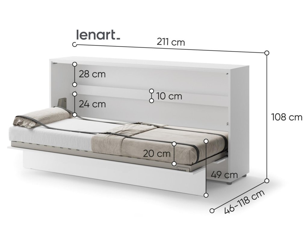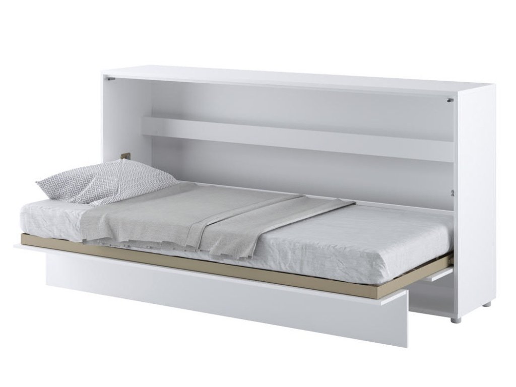 Široká výklopná postel 90 bílá lesk/bílá mat. Rozměry viz obrázek. Se sklápěcí postelí Vás už nebude trápit malý prostor Vaší domácnosti. Díky stabilní konstrukci zaručuje pohodlný odpočinek. Pneumatický mechanismus sklápění postele zajistí bezpečné otevírání a je doplněn SOFT CLOSE systémem tichého zavírání. Tento výjimečný systém Vám umožní manipulaci pouze jedním prstem. Když je postel sklopená, vypadá jako běžná skříň. Vyklopením se vytáhne celá šířka postele. Při lozložení postele má hloubku 118 cm. Uvnitř skříně jsou praktické police na knížky nebo dekorační předměty, vše máte na dosah ruky. Maximální zatížení polic je 5 kg. Rám je nutno přišroubovat ke zdi, nosnost postele je 100 kg. Rošt postele je v ceně, matrace není součástí, je potřeba ji dokoupit. Doporučujeme velikost 90 x 200 x výšku do 18 cm. Po sklopení postele vzniká prostor pod postelí o výšce 24,9 cm. Nábytek je vyroben z kvalitního lamina s ABS hranou. Lamino je odolné proti poškrábání, poškození, vlhkosti a vysokým teplotám. Postel nabízíme v několika velikostech a barevných provedeních. K posteli je možné dokoupit LED osvětlení. Dodáváme v demontovaném stavu. Můžete si prohlédnout prezentační video, klikněte ZDE.