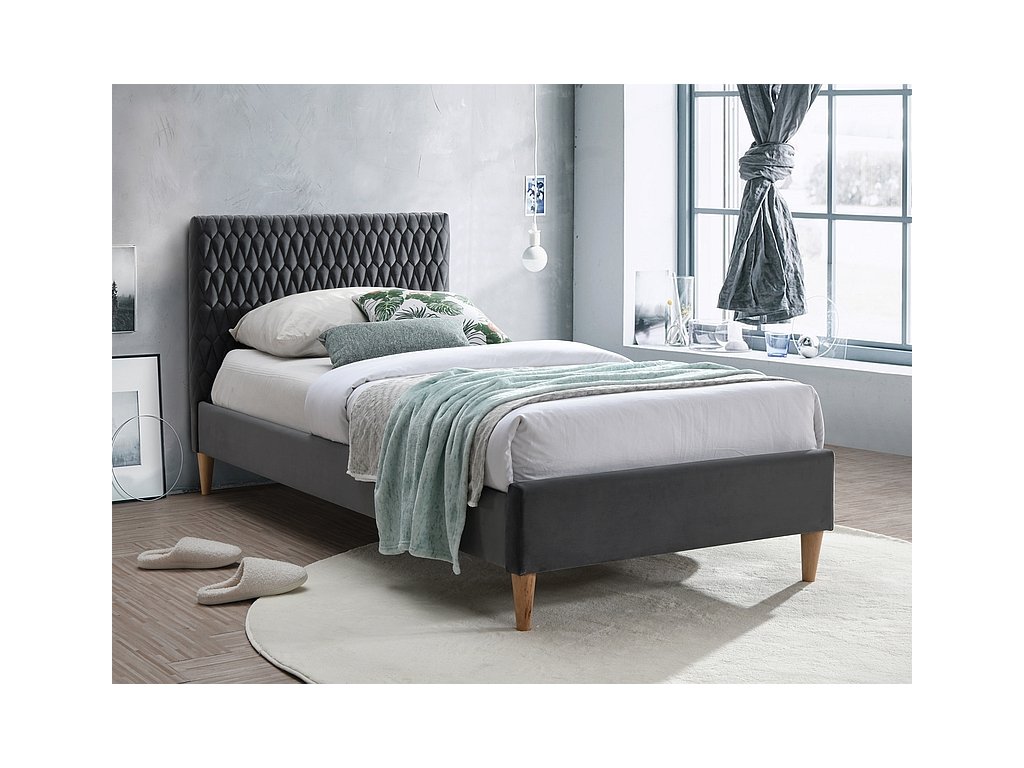 Čalouněná postel s elegantně prošívaným vysokým čelem. Konstrukce je z kvalitního přírodního dřeva potažena látkou aksamit šedé barvy. Rošt je součástí postele ( klasický lamelový rošt v plastových pouzdrech ). Matraci je nutno doobjednat o rozměrech 90 x 200 cm. Nožky jsou ze dřeva v barvě dub, vysoké 15 cm. Možnost dokoupení nočního stolku nebo lavice s úložným prostorem. Dodáváme v demontovaném stavu.Doplňkové parametry