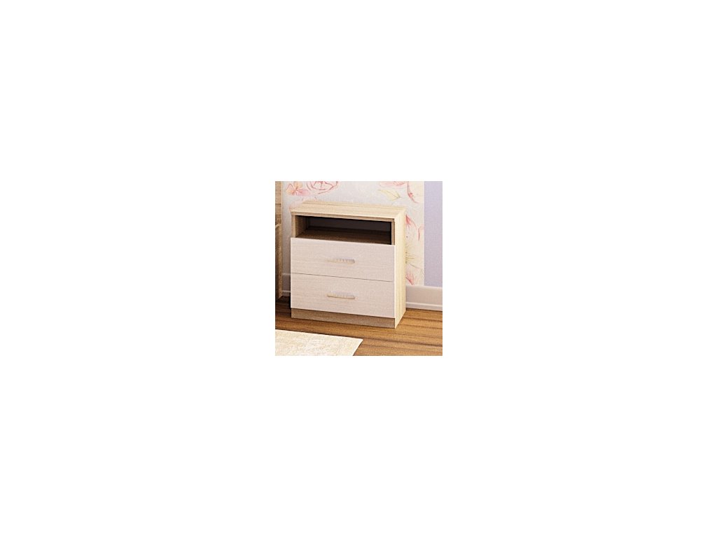 Noční stolek se dvěma zásuvkami je vyroben z LTD desky odolné vůči poškrábání, korpus je v barvě dub sonoma a čela zásuvek jsou v barvě bílá strukturální. Dodáváme v demontovaném stavu.Doplňkové parametry