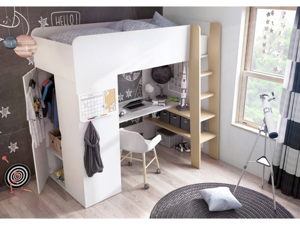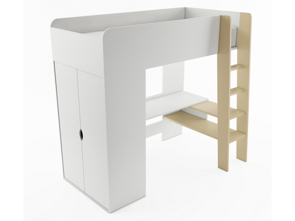 Poschoďová postel TOM je víceúčelový nábytek, který se skládá z pohodlné postele s bonnellovou matrací a útulného místa pro práci a volný čas pod ním, s prostorným stolem. TOM také nabízí prostornou dvojitou skříň, kde můžete mít všechny potřebné věci. Díky své konstrukci může nábytek využít stejný prostor dvakrát, proto vhodné i do menších pokojů. Postel vyrobena z kvalitní LTD v barvě bílá/congo. LTD je odolné vůči vysokým teplotám, poškrábání a nárazům, hraněné ABS páskou. Postel nelze vyrobit v opačné verzi. Dodáváme v demontovaném stavu.Doplňkové parametry