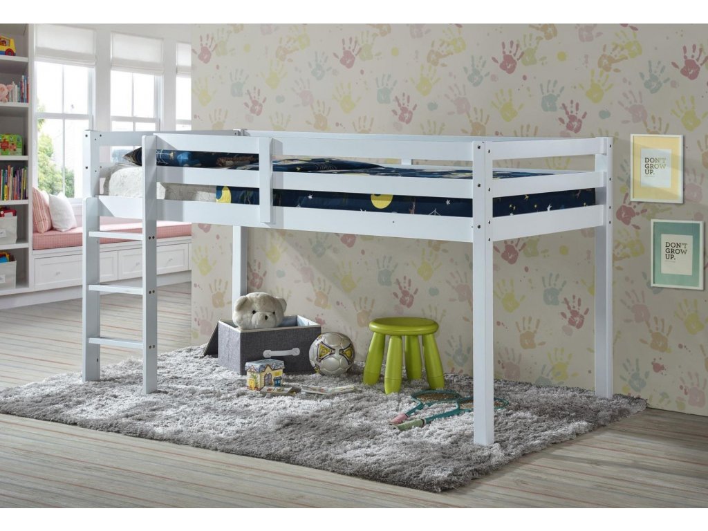 Dřevěná postel patrová v barevném provedení matná bílá. Umístěním postele v patře se nabízí využití prostoru pod postelí jako hrací koutek. Součástí je laťový rošt, matraci je potřeba doobjednat - 90 x 200 cm. Dodáváme v demontovaném stavu.Doplňkové parametry