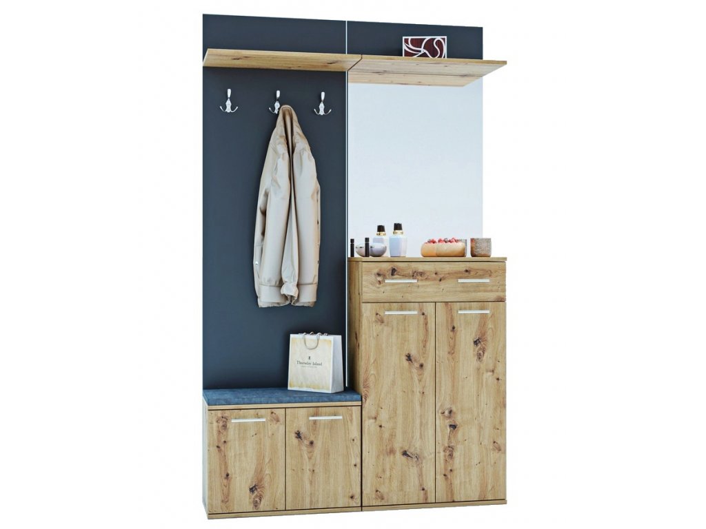 Předsíňová stěna vyrobená z kvalitní laminátové desky ( zadní panel HDF ) v barevném provedení dub artisan/antracit. Sestava se skládá ( š/v/h ) - panel s věšákem a komodou ( 60 x 200 x 30 cm ) a panel se zrcadlem a botníkem se zásuvkou ( 60 x 200 x 30 ). Další rozměry viz perokresba. Sedací polštářek je v ceně (barevné provedení polštářku se od obrázku může lišit). Dodáváme v demontovaném stavu.Doplňkové parametry