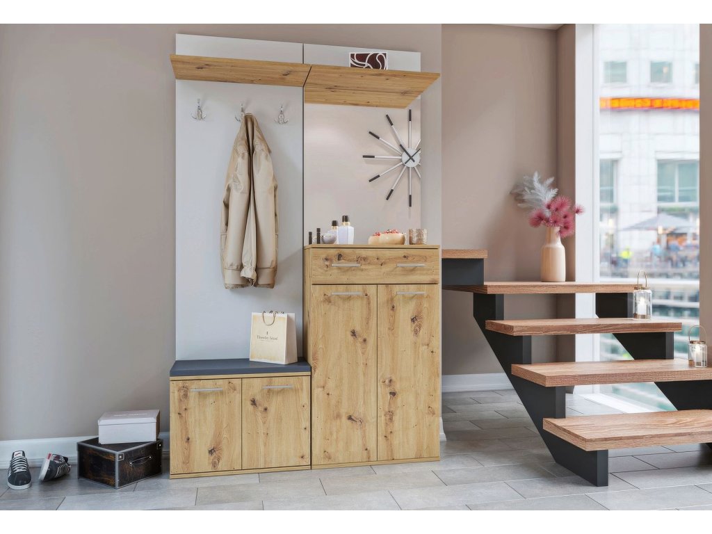 Předsíňová stěna vyrobená z kvalitní laminátové desky ( zadní panel HDF ) v barevném provedení dub artisan/bílá. Sestava se skládá ( š/v/h ) - panel s věšákem a komodou ( 60 x 200 x 30 cm ) a panel se zrcadlem a botníkem se zásuvkou ( 60 x 200 x 30 ). Další rozměry viz perokresba. Sedací polštářek je v ceně (barevné provedení polštářku se od obrázku může lišit). Dodáváme v demontovaném stavu.Doplňkové parametry