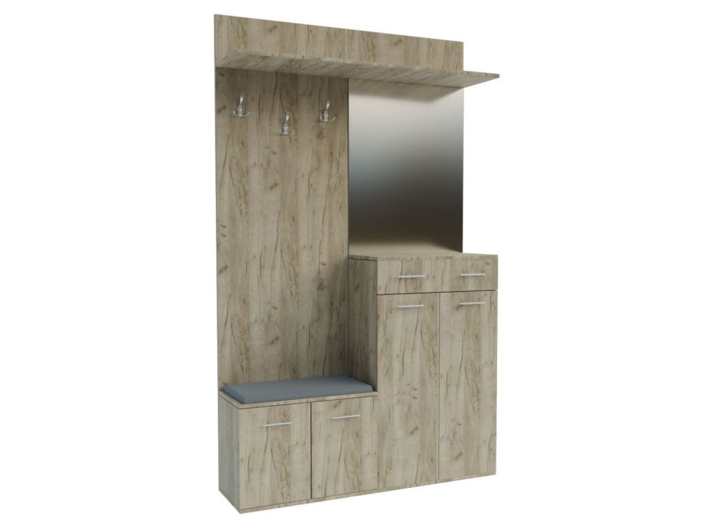 Předsíňová stěna vyrobená z kvalitní laminátové desky ( zadní panel HDF ) v barevném provedení dub kraft šedý. Sestava se skládá ( š/v/h ) - panel s věšákem a komodou ( 60 x 200 x 30 cm ) a panel se zrcadlem a botníkem se zásuvkou ( 60 x 200 x 30 ). Další rozměry viz perokresba. Sedací polštářek je v ceně (barevné provedení polštářku se od obrázku může lišit). Dodáváme v demontovaném stavu.Doplňkové parametry