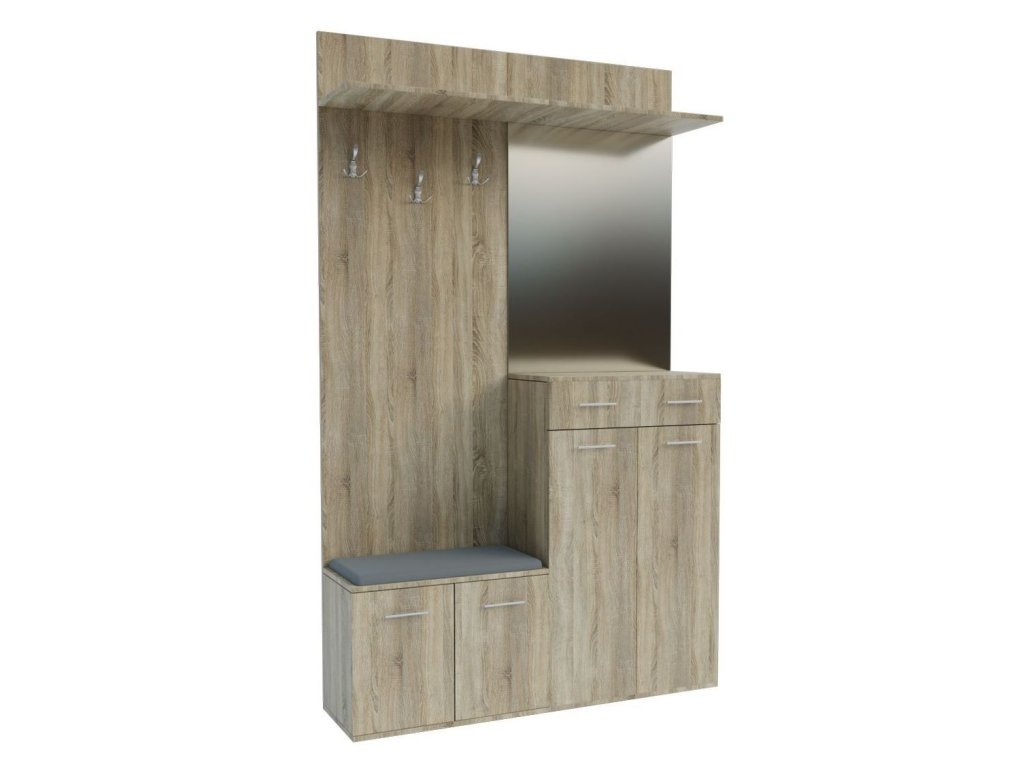 Předsíňová stěna vyrobená z kvalitní laminátové desky ( zadní panel HDF ). Korpus i dvířka jsou v barevném provedení dub sonoma. Sestava se skládá ( š/v/h ) - panel s věšákem a komodou ( 60 x 200 x 30 cm ) a panel se zrcadlem a botníkem se zásuvkou ( 60 x 200 x 30 ). Další rozměry viz perokresba. Sedací polštářek je v ceně (barevné provedení polštářku se od obrázku může lišit). Dodáváme v demontovaném stavu.Doplňkové parametry