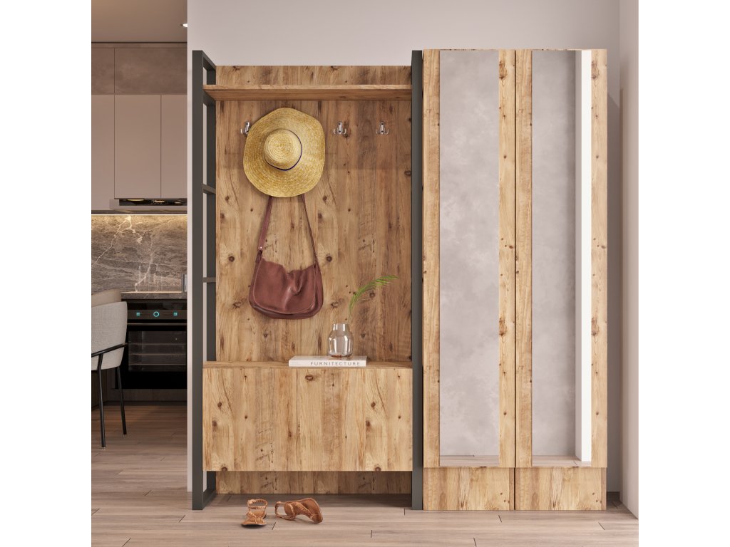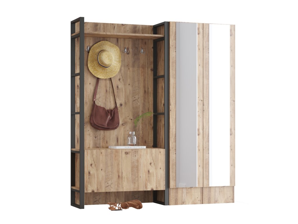 je ideální volbou pro ty, kteří hledají nejen funkční, ale i stylové řešení pro svůj vstupní prostor. Věšáková stěna nabízí místo pro kabáty, tašky nebo deštníky, zatímco dvě skříně se zrcadlem poskytují dostatek úložného prostoru a zároveň opticky zvětšují prostor předsíně. Sestava se dokonale hodí do moderních a industriálních interiérů.