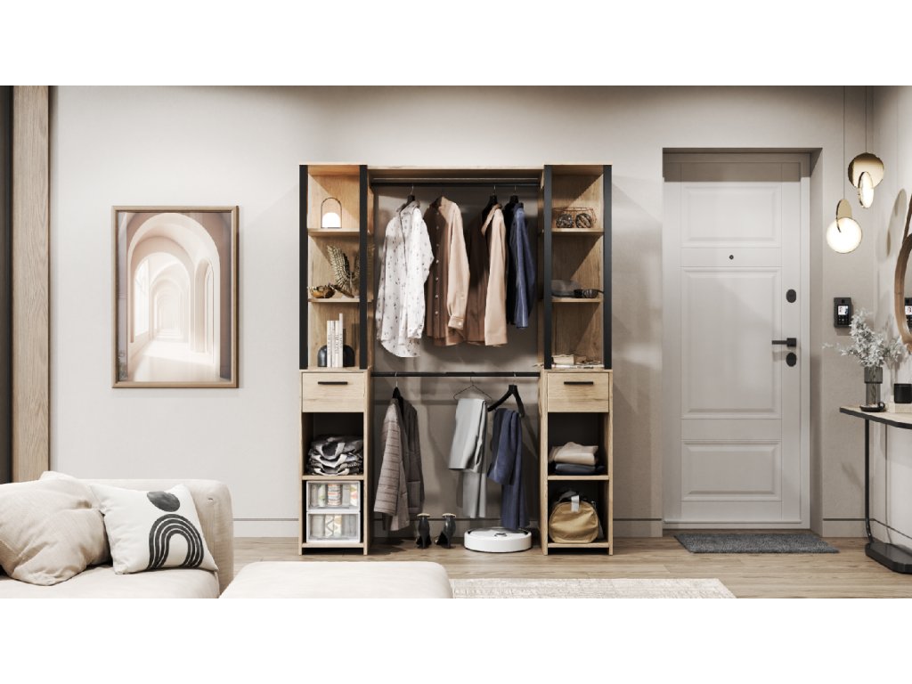 Šatna nabízí dostatek úložného prostoru díky 2 prostorným zásuvkám, otevřeným policím a 2 šatním tyčím, které umožňují přehledné uspořádání oblečení, kabátů či doplňků. Jeho otevřená konstrukce usnadňuje přístup a dodává interiéru vzdušný, elegantní vzhled.