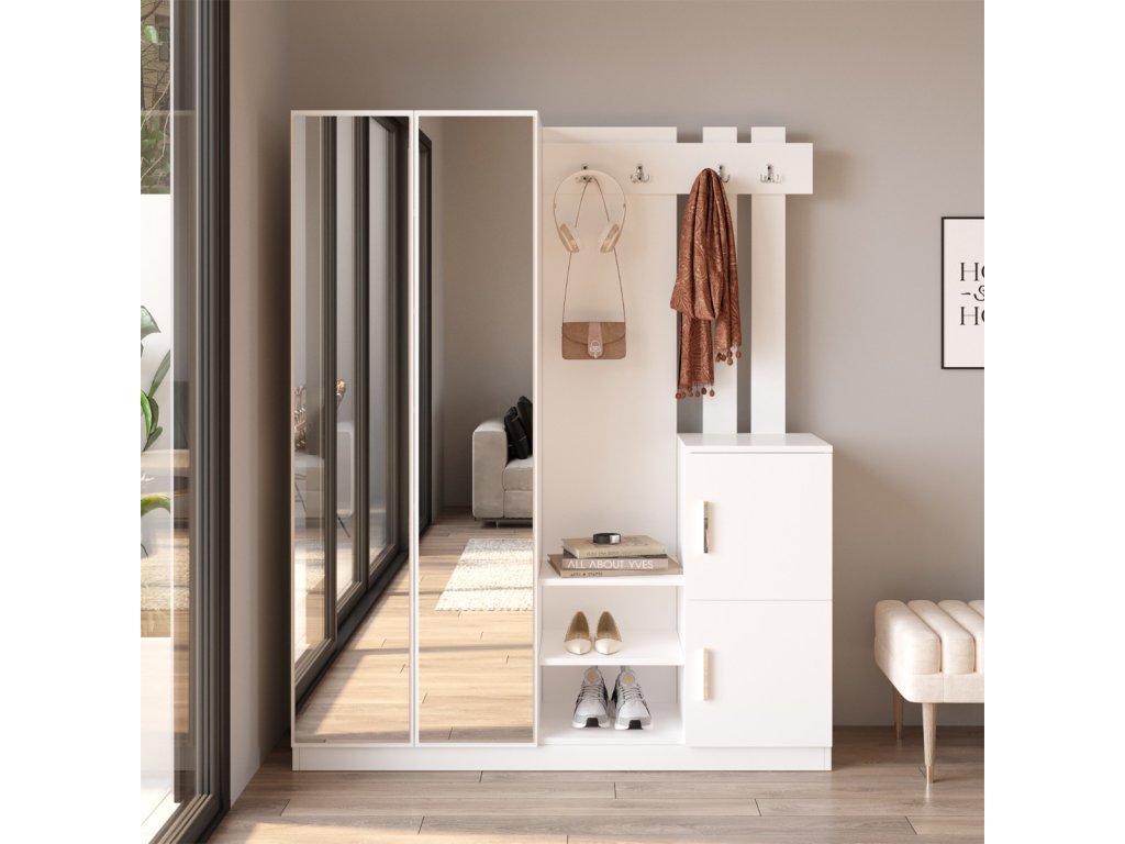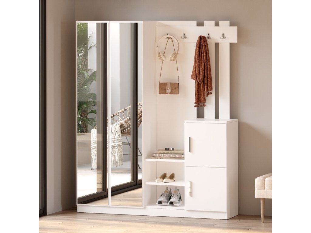 Vybavení sestavy je promyšlené a funkční. Věšáky umožní praktické uspořádání kabátů a bund, zrcadlo nejen zvětší prostor, ale také přidá hloubku a světlo. Skříň a integrovaný šatník (v sestavě) udrží vaše věci uspořádané a snadno dostupné.