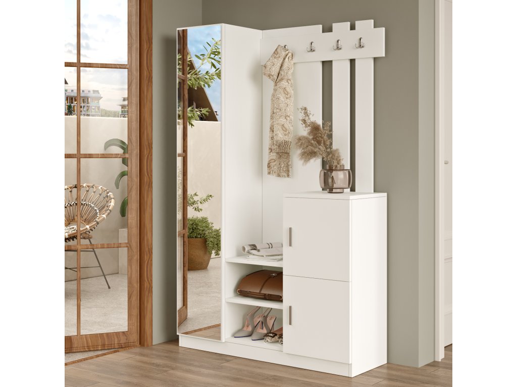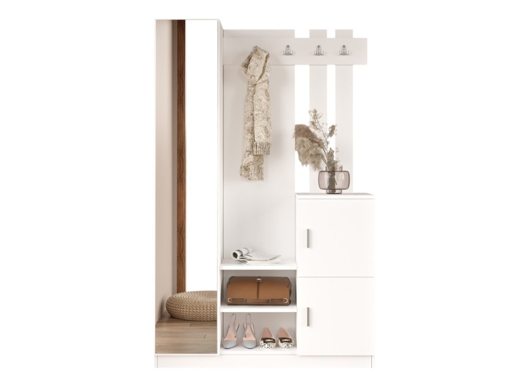 kombinuje styl a funkčnost. Věšáková stěna se skříňkou poskytuje prostor pro zavěšení kabátů, tašek nebo deštníků, zatímco policová skříň se zrcadlem umožňuje uložit boty, doplňky nebo jiné nezbytnosti. Zrcadlo navíc opticky zvětšuje prostor a přináší do předsíně více světla. Díky bílému provedení vynikne sestava v každém interiéru.