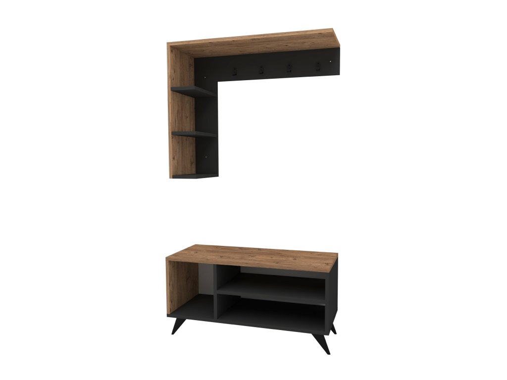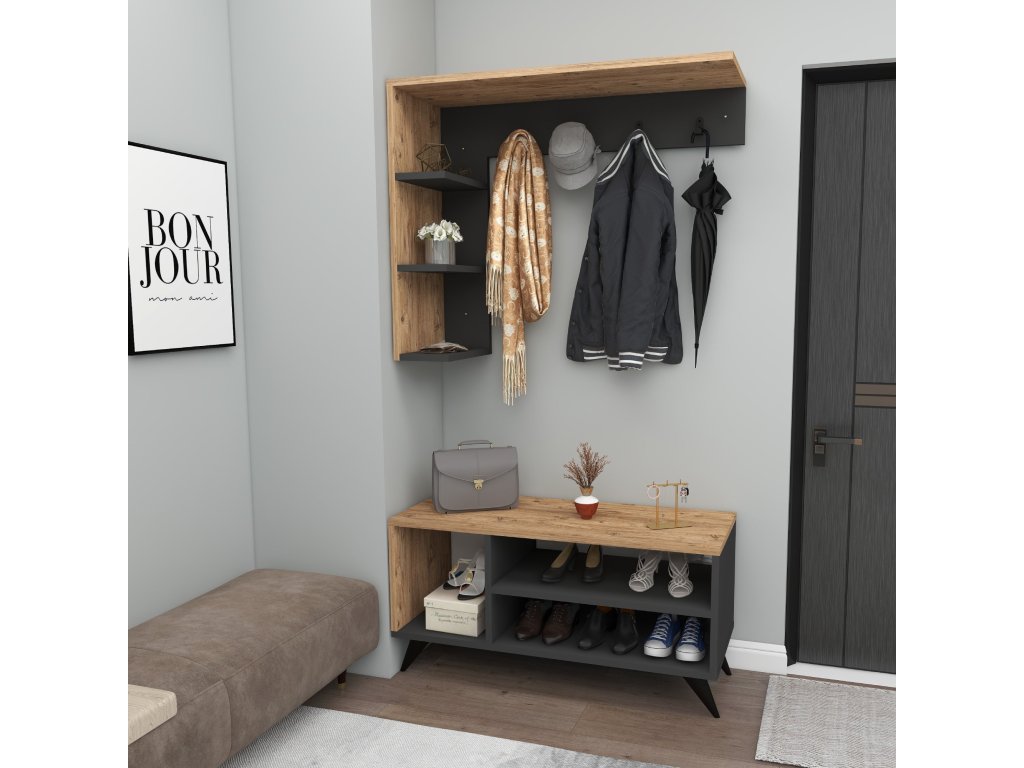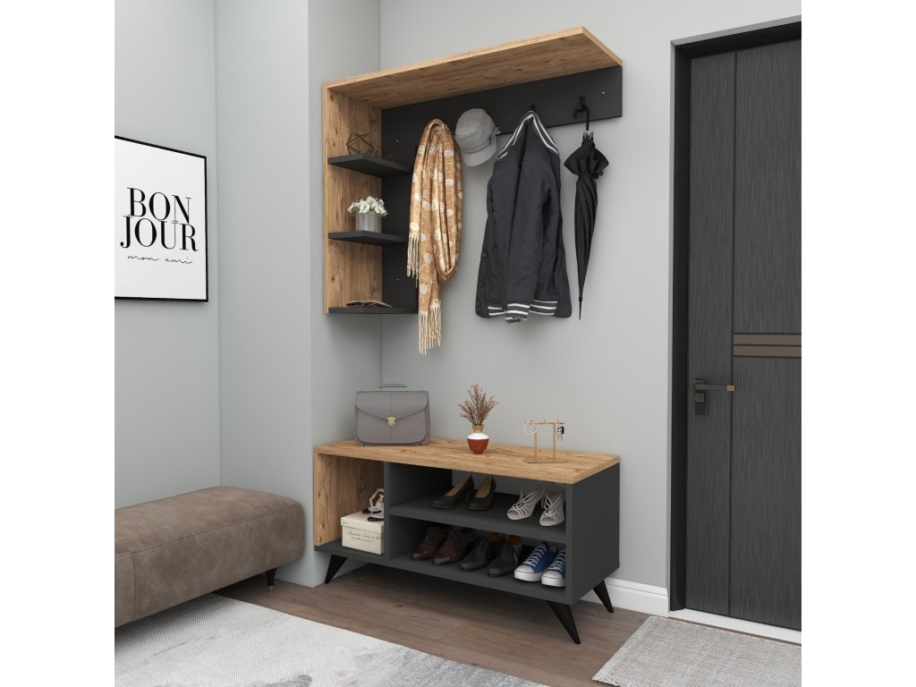 Předsíňová sestava kombinuje moderní design a praktické uspořádání, které pomůže udržet předsíň přehlednou a stylovou. Tato sestava zahrnuje skříňku na boty a horní polici s věšáky, což poskytuje dostatek prostoru pro uložení obuvi, kabátů a dalších doplňků.