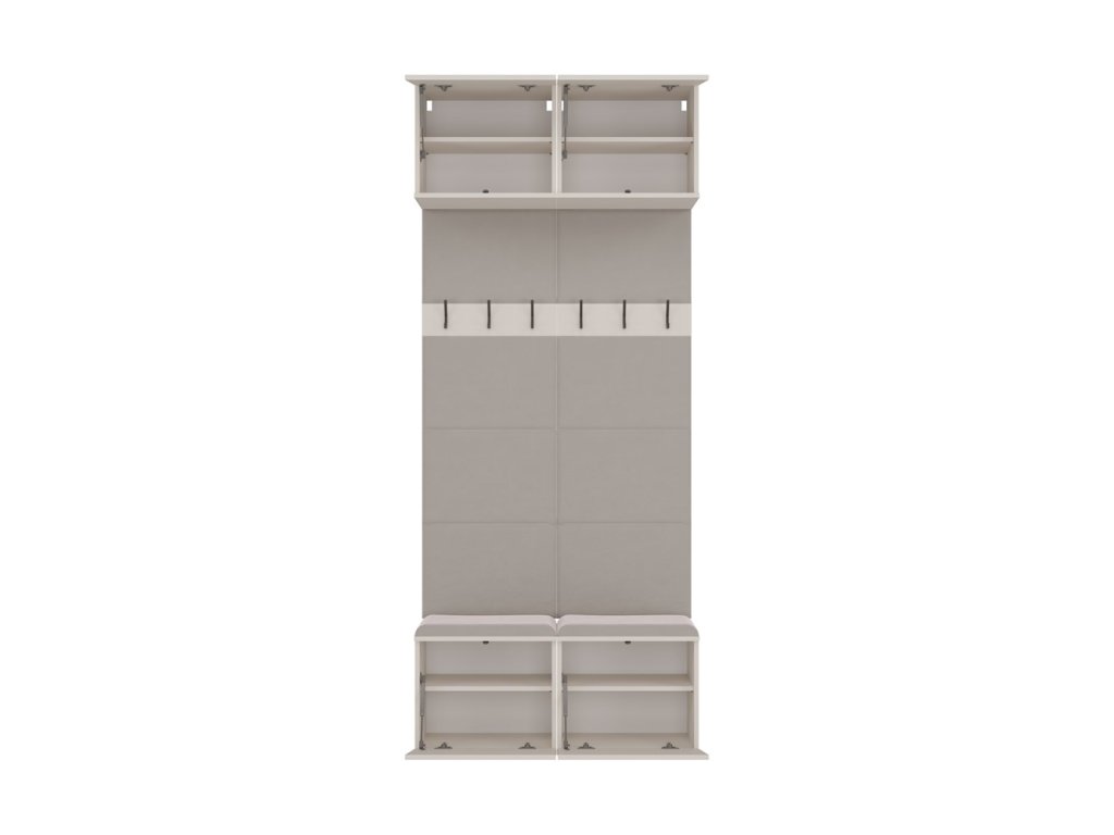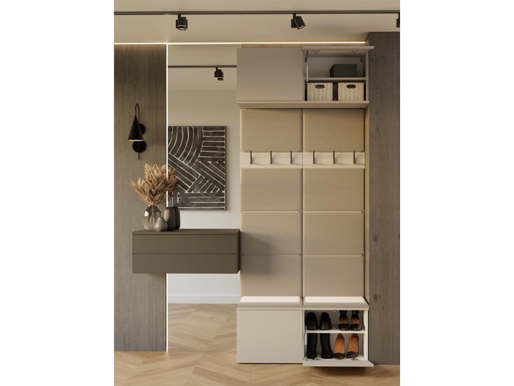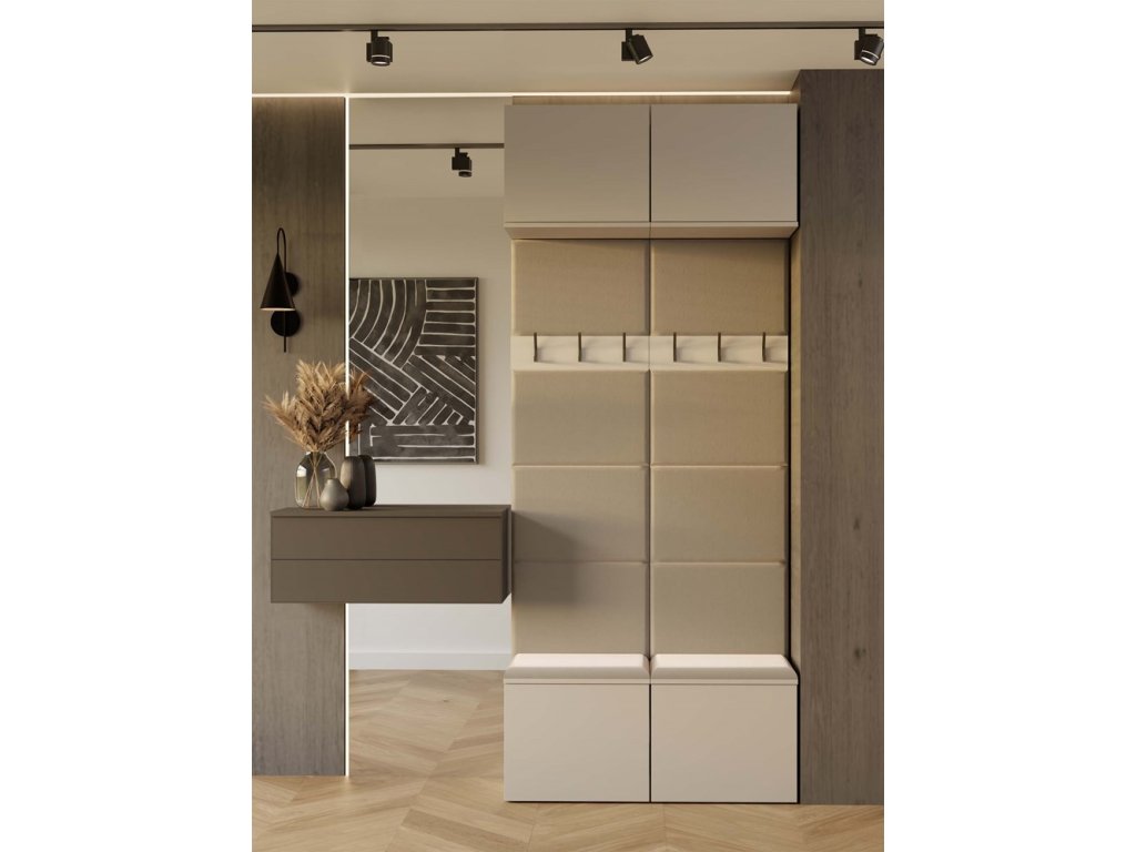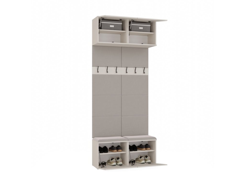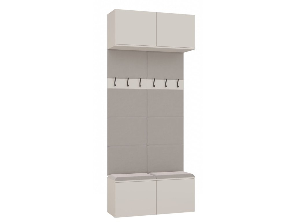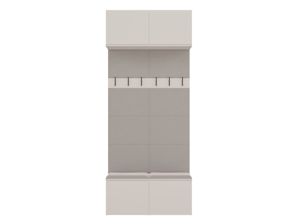 Věšákový panel obsahuje čalouněné opěradlo, sedák, tři háčky a skříňky nahoře i dole. Čelní plochy jsou řešeny v minimalistickém designu bez úchytů – s praktickým otevíráním na dotek díky systému TIP-ON.