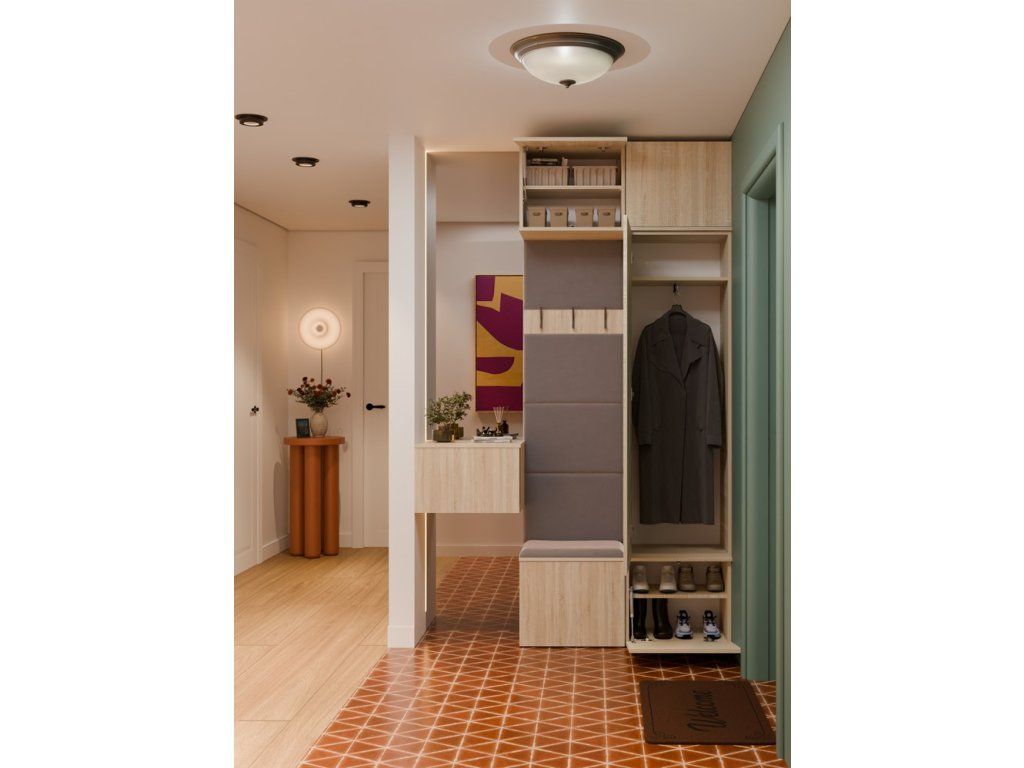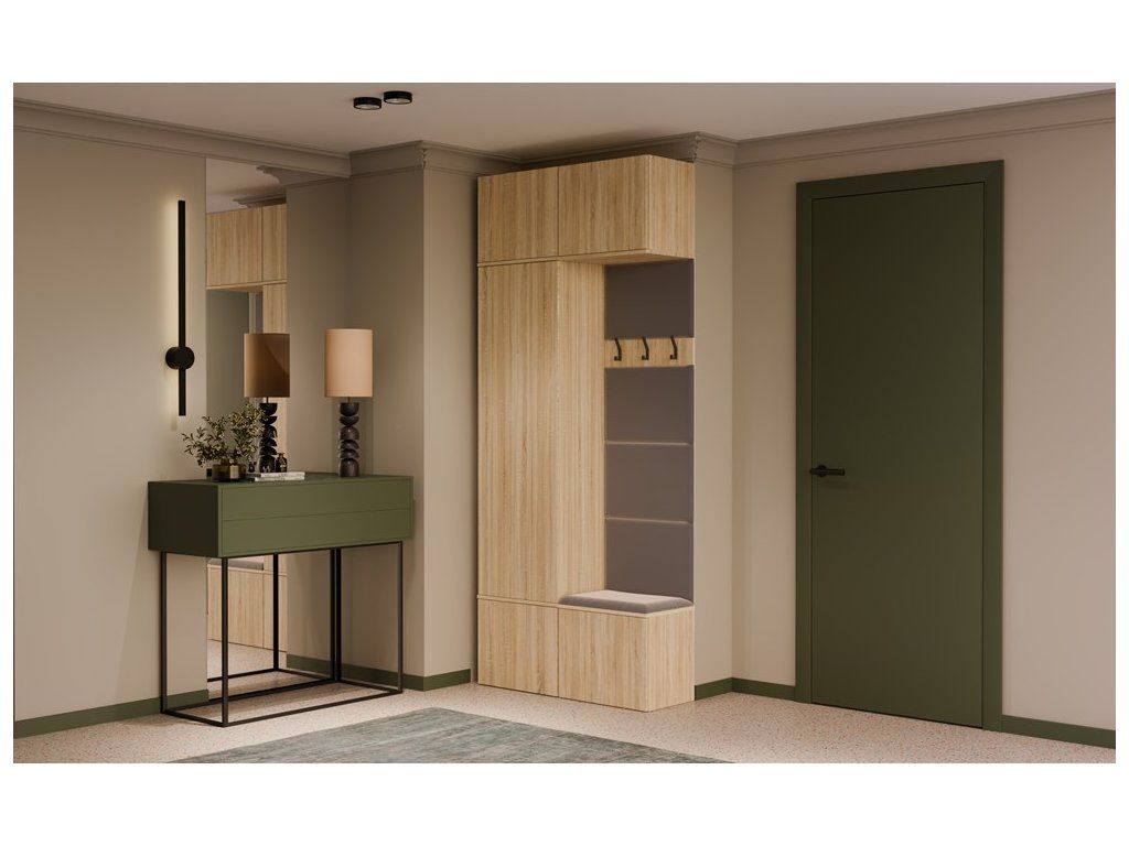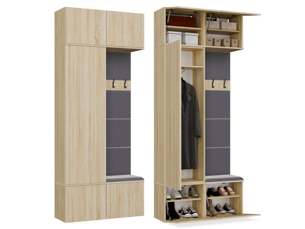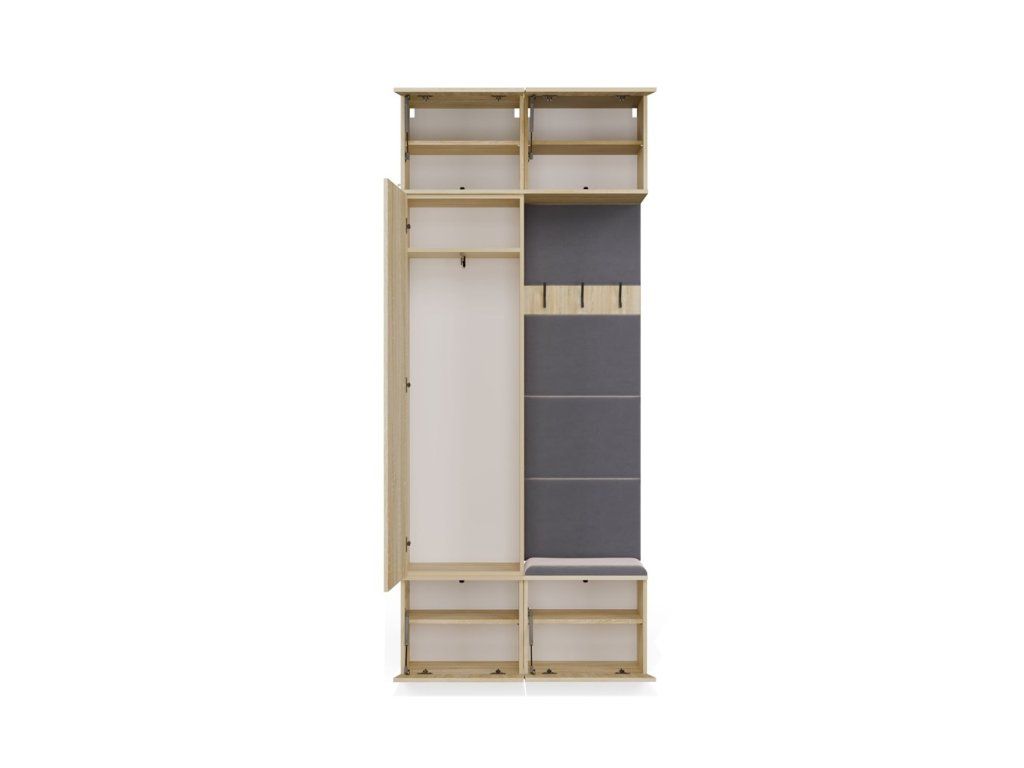 Sestava nabízí kombinaci jedné skříně a jednoho věšákového panelu, takže snadno vytvoříte funkční zónu pro zavěšené oblečení, složené věci i obuv. Skříně mají horní a spodní úložnou část, prostřední prostor s výsuvnou tyčí na ramínka a policí, zatímco věšákový panel doplňuje čalouněné opěradlo, sedák, tři háčky a skříňky nahoře i dole. Bezúchytové provedení s otevíráním TIP-ON působí čistě a usnadní každodenní používání. V dekoru dub sonoma působí sestava přirozeně, prosvětlí prostor a snadno se kombinuje s dalším nábytkem v předsíni.