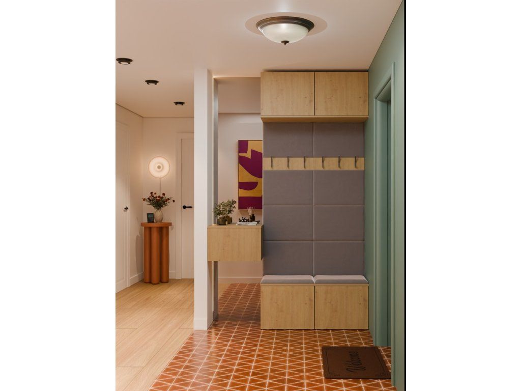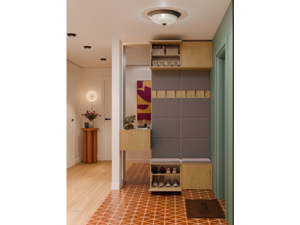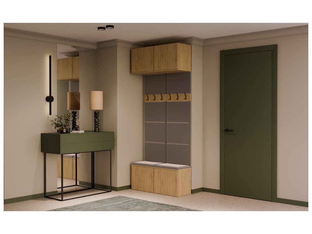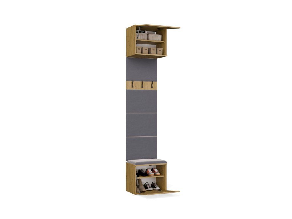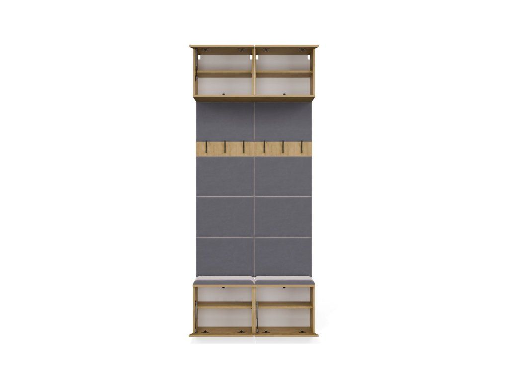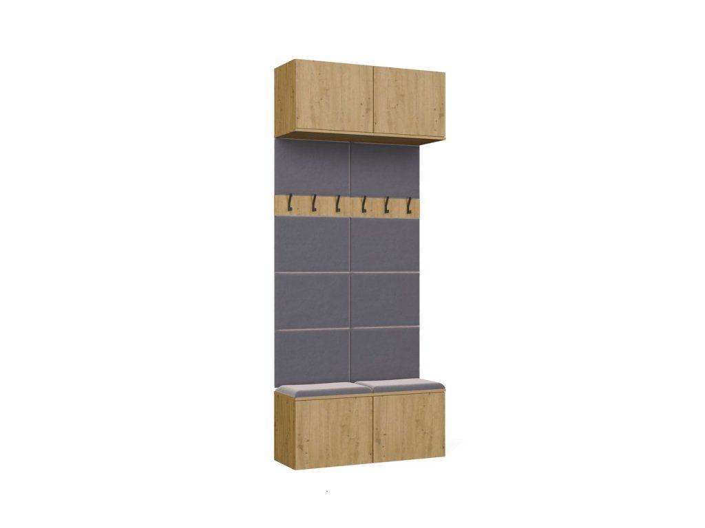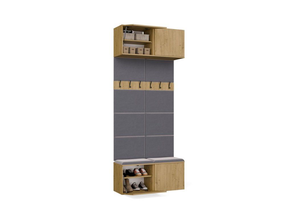 Sestava obsahuje dva věšákové panely s čalouněným opěradlem a sedákem, třemi háčky a praktickými skříňkami v horní i spodní části. Díky tomu získáte kompaktní a dobře využitý prostor pro obuv, tašky i věci, které chcete mít po ruce hned po příchodu domů. Bezúchytové provedení s otevíráním TIP-ON navíc podtrhuje čistý a moderní vzhled celé sestavy.