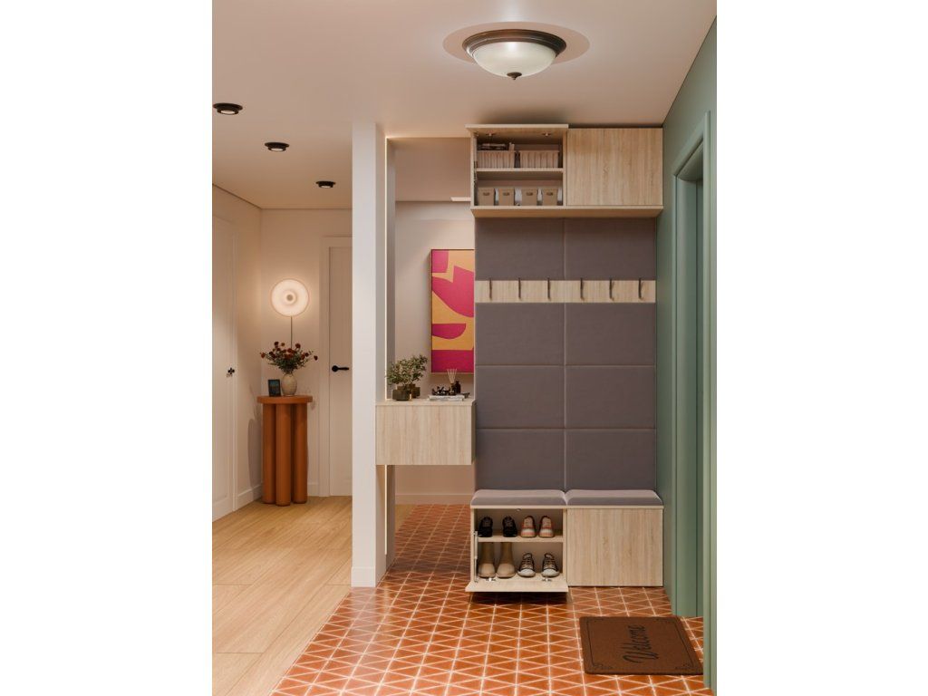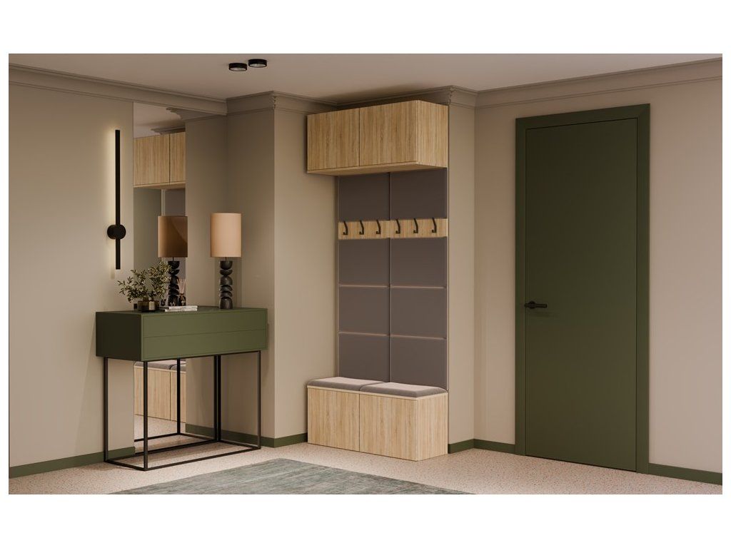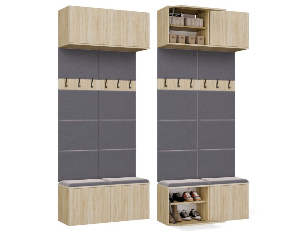 Sestava obsahuje dva věšákové panely s čalouněným opěradlem a sedákem, tři háčky a praktické skříňky v horní i spodní části. Díky tomu získáte kompaktní a dobře využitý prostor pro obuv, tašky i věci, které chcete mít po ruce hned po příchodu domů. Bezúchytové provedení s otevíráním TIP-ON navíc podtrhuje čistý a moderní vzhled. V dekoru dub sonoma působí sestava přirozeně, prosvětlí prostor a snadno se kombinuje s dalším nábytkem v předsíni.
