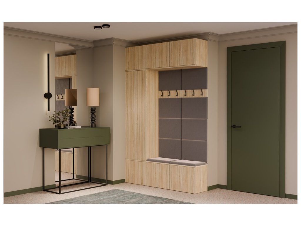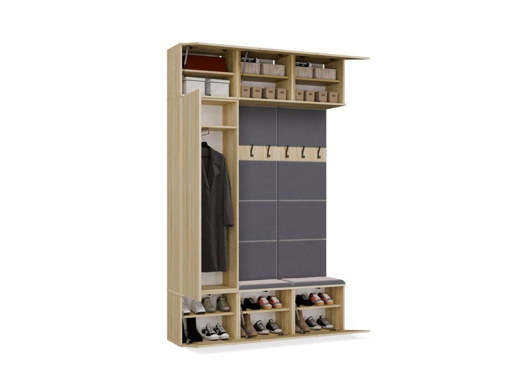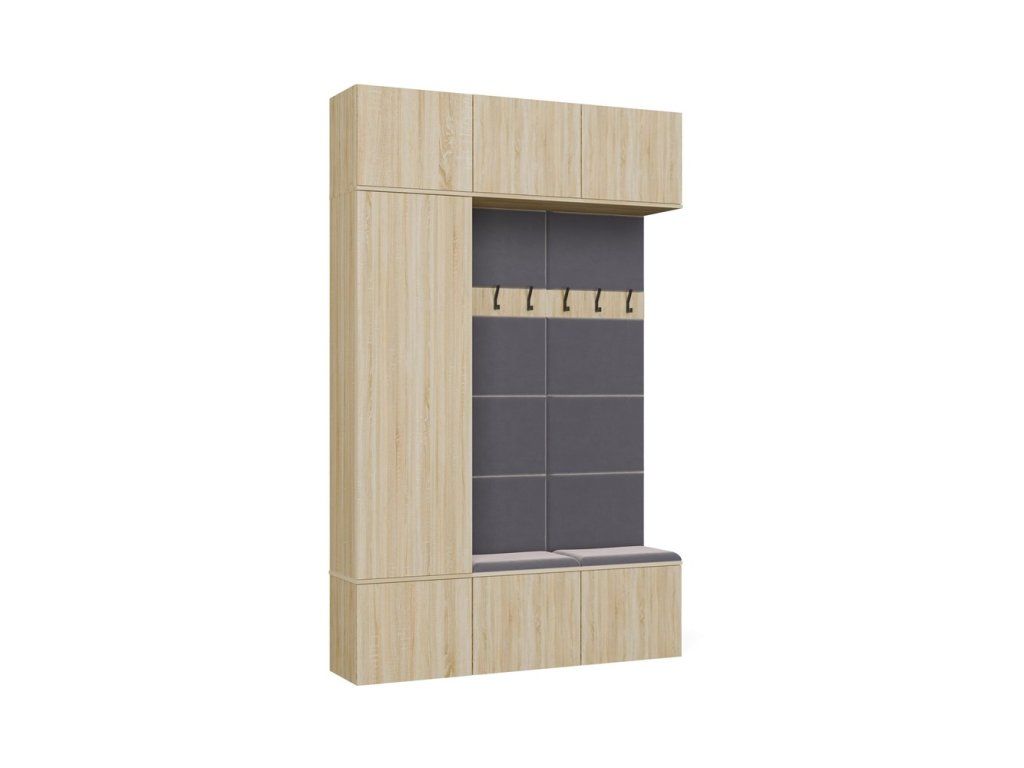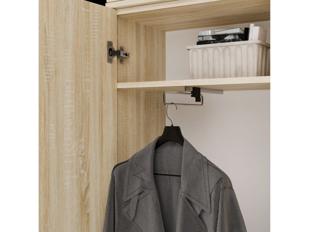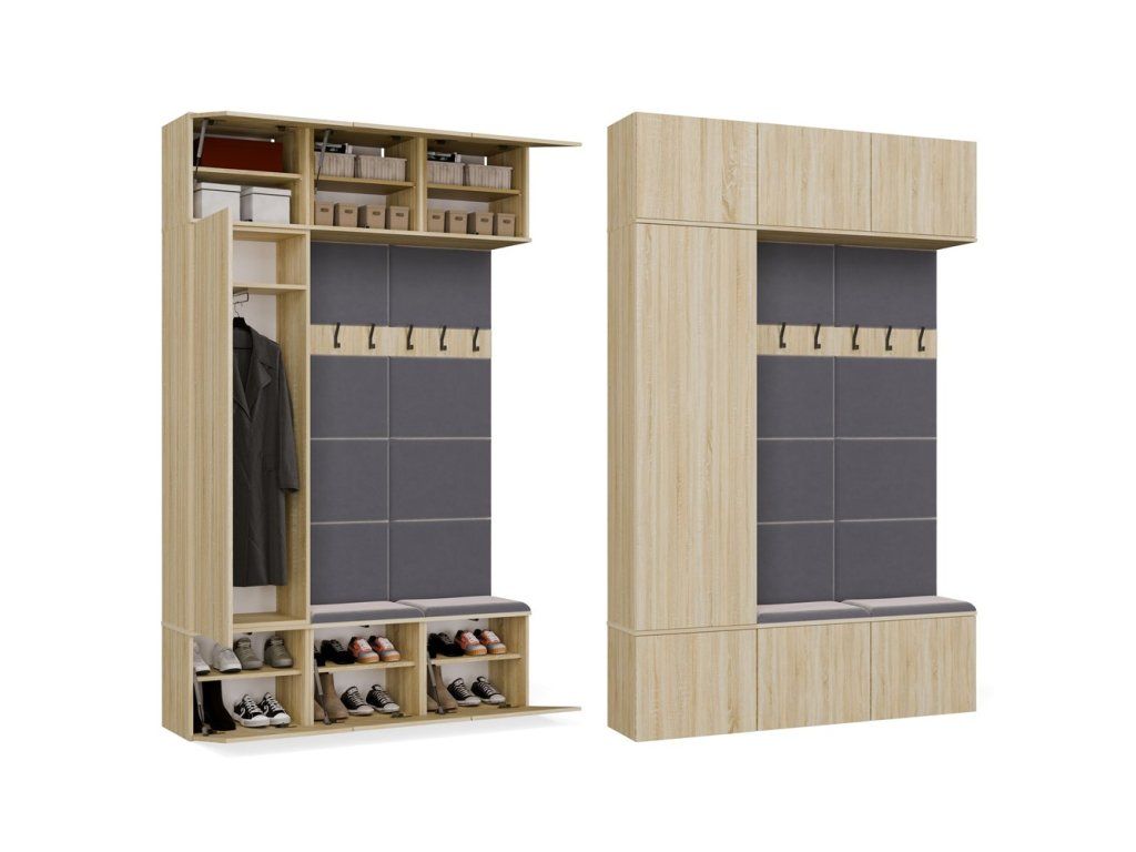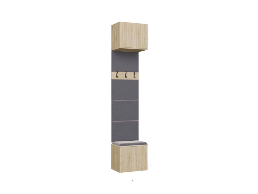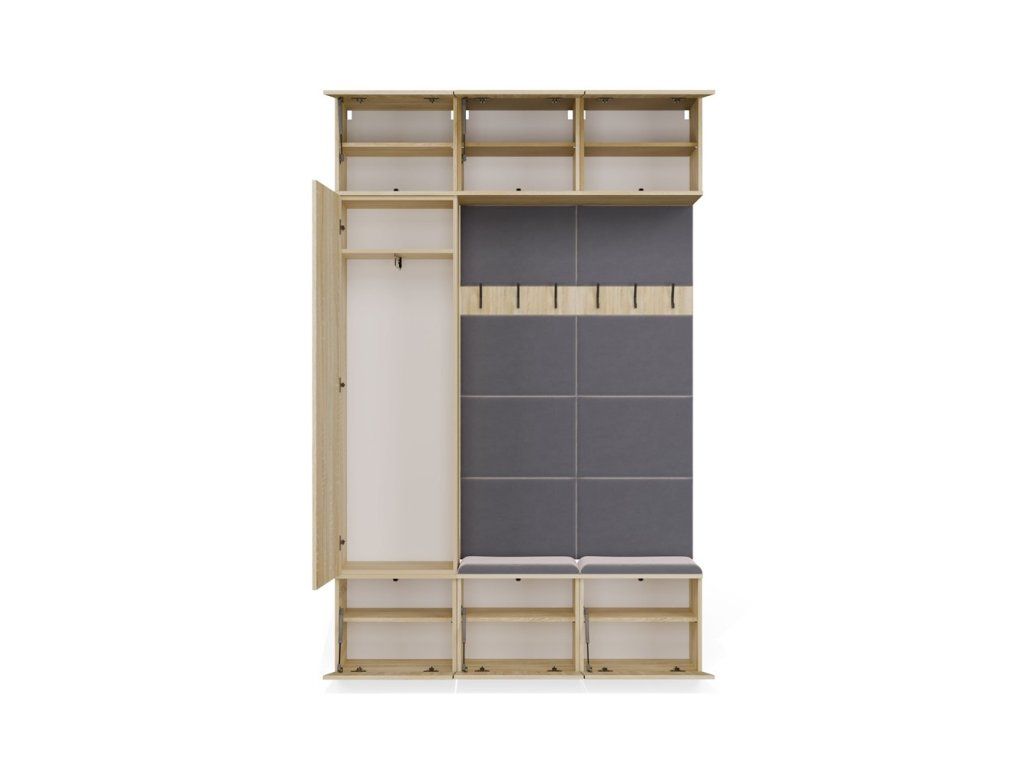 Sestava nabízí kombinaci jedné skříně a dvou věšákových panelů, takže snadno vytvoříte funkční zónu pro zavěšené oblečení, složené věci i obuv. Skříně mají horní a spodní úložnou část, prostřední prostor s výsuvnou tyčí na ramínka a policí, zatímco věšákový panel doplňuje čalouněné opěradlo, sedák, tři háčky a skříňky nahoře i dole. Bezúchytové provedení s otevíráním TIP-ON působí čistě a usnadní každodenní používání. V dekoru dub sonoma působí sestava přirozeně, prosvětlí prostor a snadno se kombinuje s dalším nábytkem v předsíni.