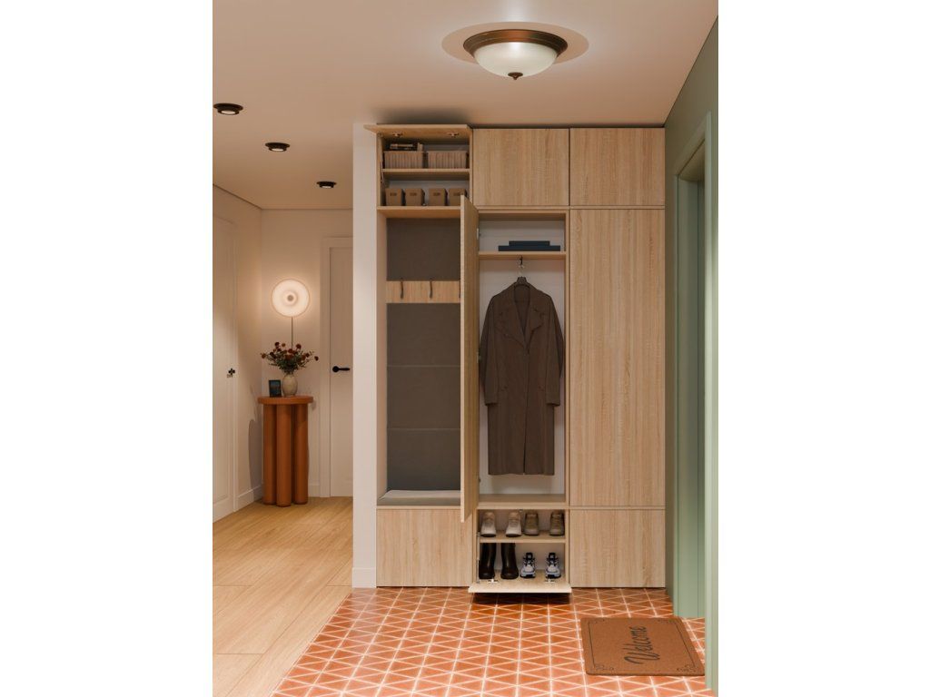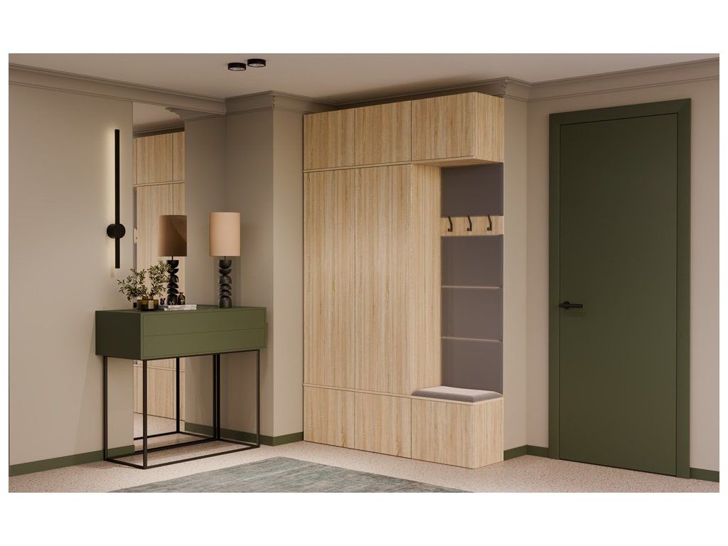 Sestava nabízí kombinaci dvou skříní a jednoho věšákového panelu, takže snadno vytvoříte funkční zónu pro zavěšené oblečení, složené věci i obuv. Skříně mají horní a spodní úložnou část, prostřední prostor s výsuvnou tyčí na ramínka a policí, zatímco věšákový panel doplňuje čalouněné opěradlo, sedák, tři háčky a skříňky nahoře i dole. Bezúchytové provedení s otevíráním TIP-ON působí čistě a usnadní každodenní používání. V dekoru dub sonoma působí sestava přirozeně, prosvětlí prostor a snadno se kombinuje s dalším nábytkem v předsíni.