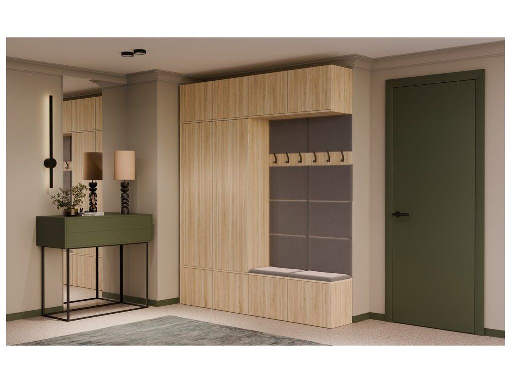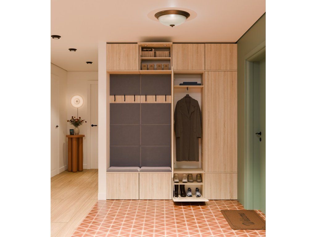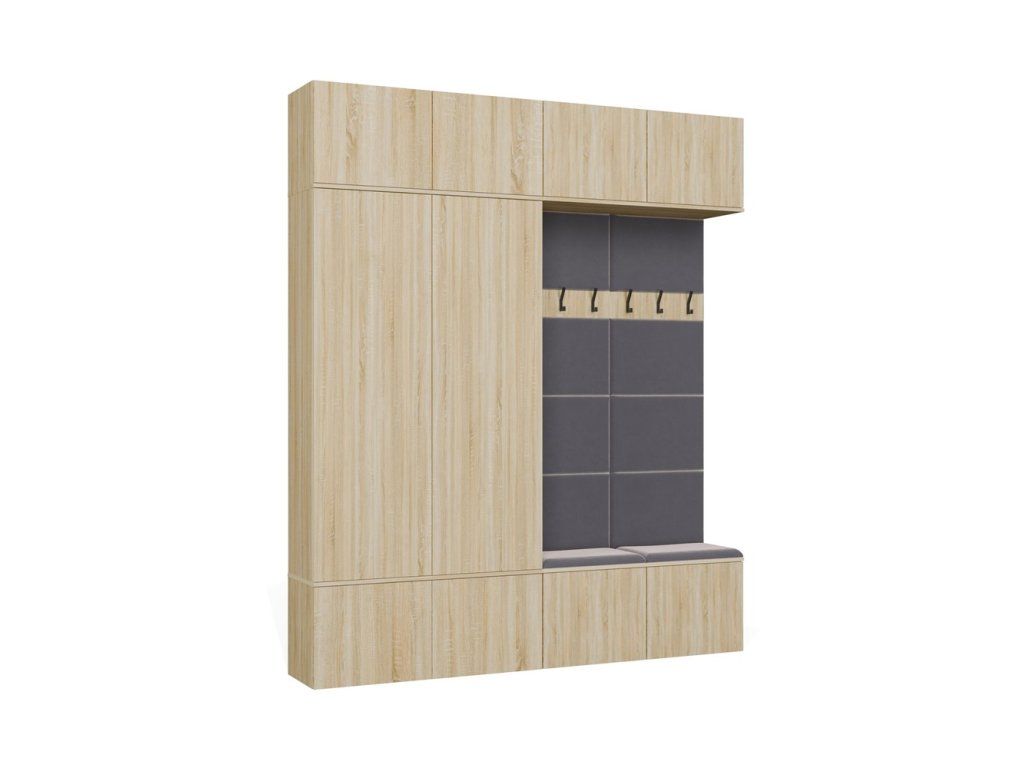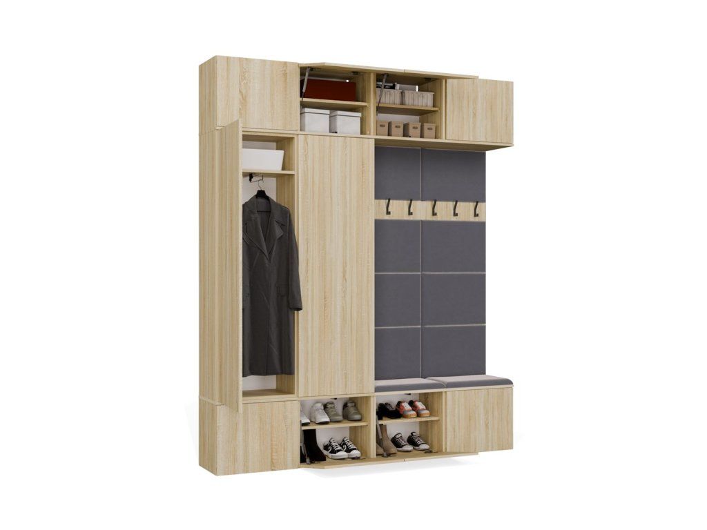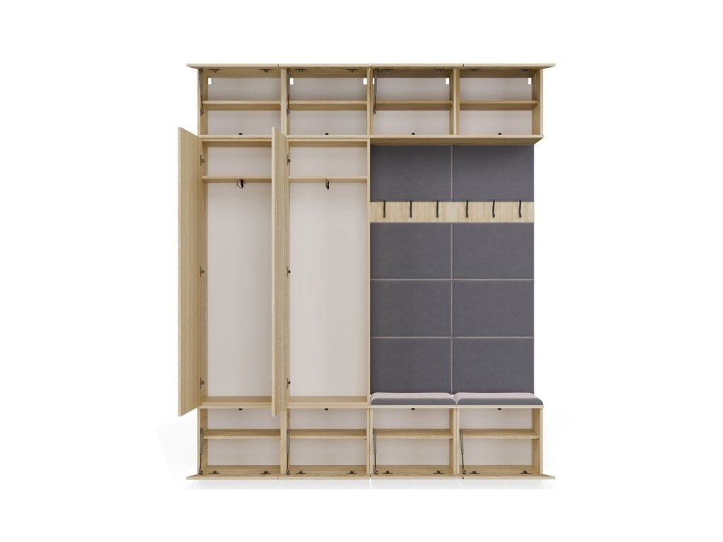 Sestava nabízí kombinaci dvou skříní a dvou věšákových panelů, takže snadno vytvoříte funkční zónu pro zavěšené oblečení, složené věci i obuv. Skříně mají horní a spodní úložnou část, prostřední prostor s výsuvnou tyčí na ramínka a policí, zatímco věšákový panel doplňuje čalouněné opěradlo, sedák, tři háčky a skříňky nahoře i dole. Bezúchytové provedení s otevíráním TIP-ON působí čistě a usnadní každodenní používání. V dekoru dub sonoma působí sestava přirozeně, prosvětlí prostor a snadno se kombinuje s dalším nábytkem v předsíni.
