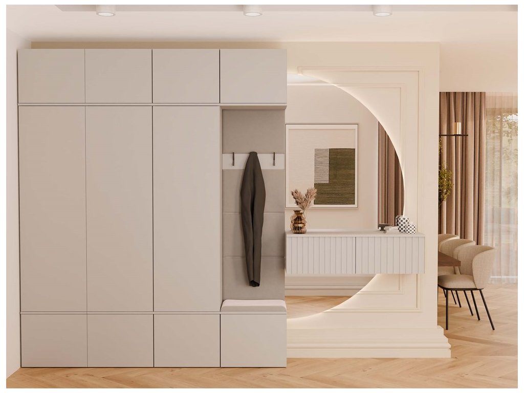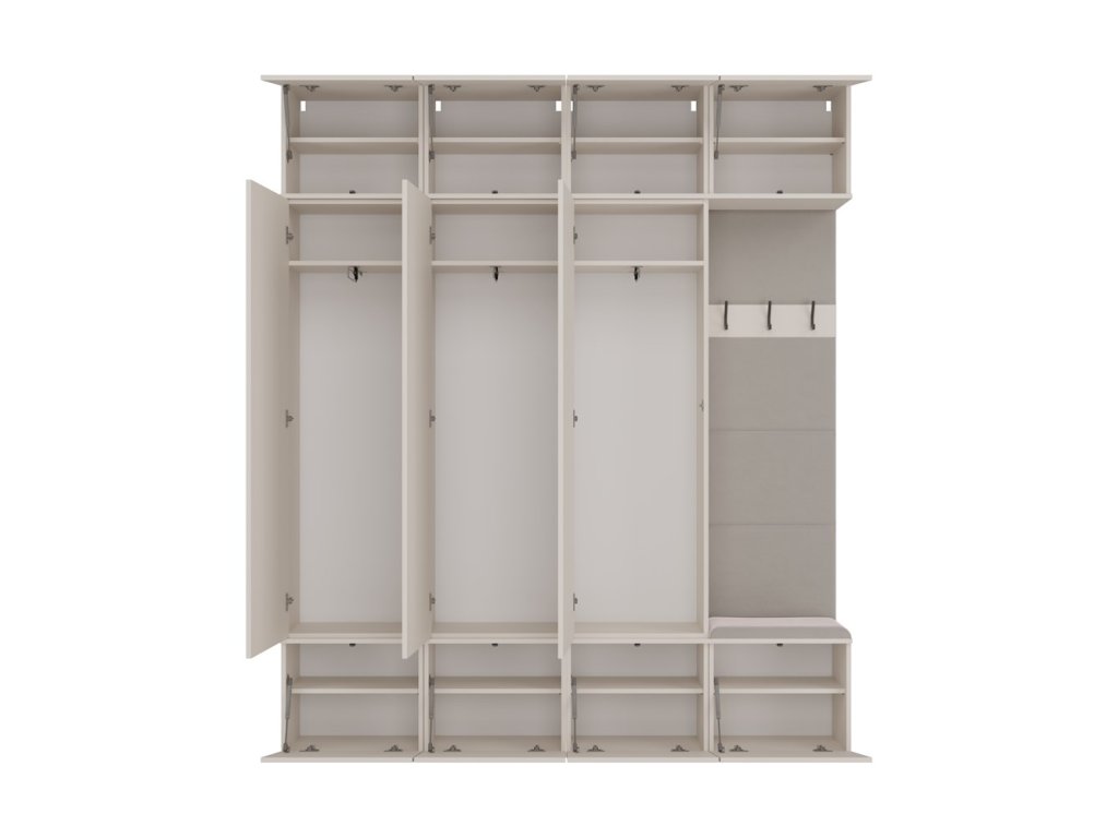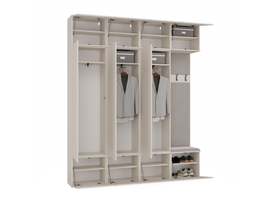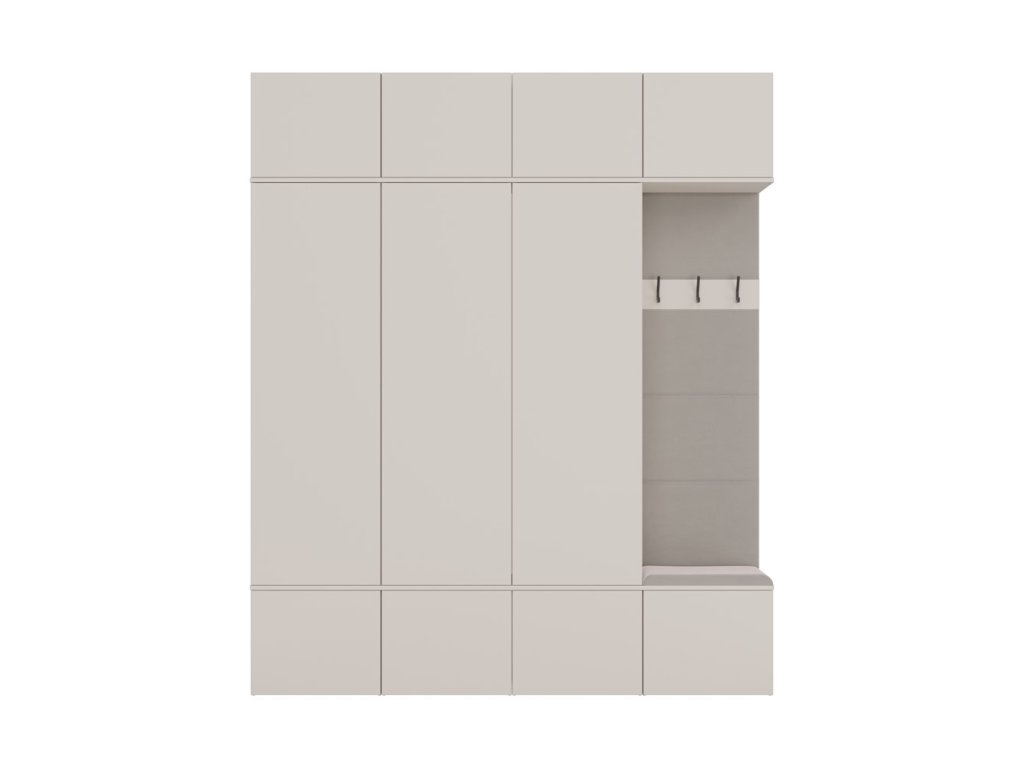 Věšákový panel obsahuje čalouněné opěradlo, sedák, tři háčky a skříňky nahoře i dole. Čelní plochy jsou řešeny v minimalistickém designu bez úchytů – s praktickým otevíráním na dotek díky systému TIP-ON.