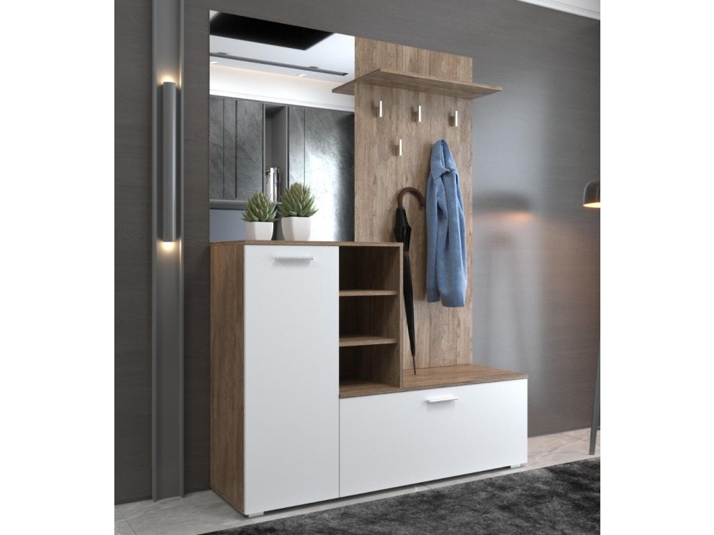 Předsíňová sestava poskytuje praktické a stylové řešení pro vaši předsíň. Barevné provedení je dub Ansberg tmavý/bílá mat. Sestava obsahuje - věšáky, odkládací police, skříňky na boty, zrcadlo, otevřené police. Materiál je kombinace LTD 22 a 16 mm. Je navržena tak, aby přinesla pořádek a styl do vašeho vstupního prostoru. Dodáváme v demontovaném stavu.Doplňkové parametry