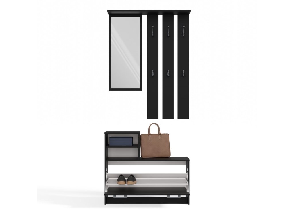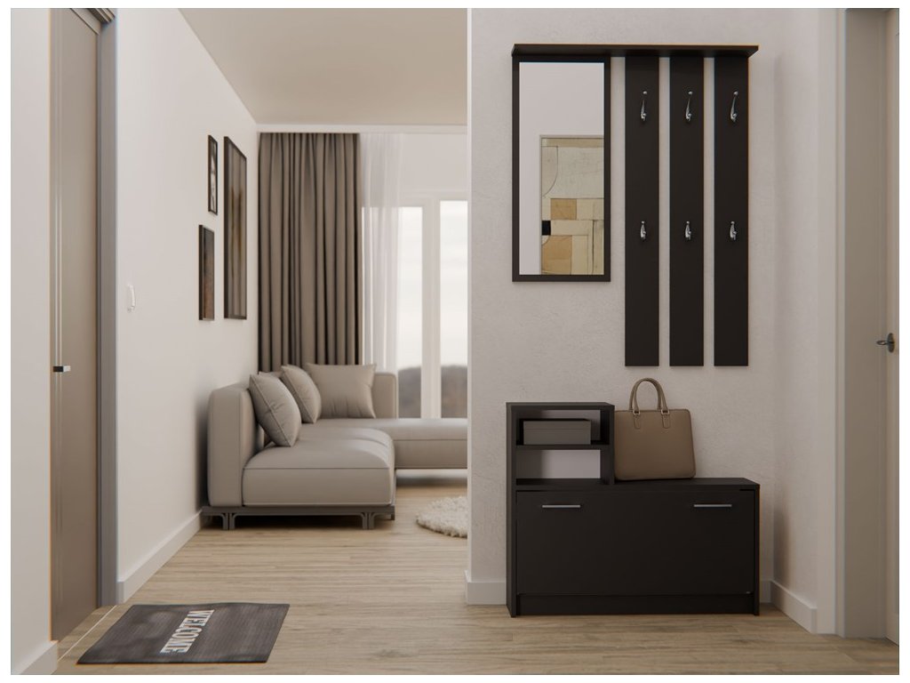Moderní předsíňová sestava, která vytvoří funkční a pohodlnou předsíň.Hlavní výhody: Botník s podsedákem 6 stylových černých věšáků Praktické zrcadlo s poličkou ...