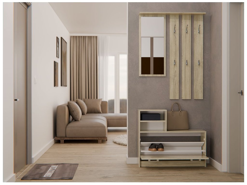 Předsíňová stěna vyrobená z kvalitní laminátové desky v barevném provedení bílá (NImfea alba). Sestava se skládá ( š/v/h ) - panel s věšákem ( 60 x 138 x 23,2 cm ), komoda se...