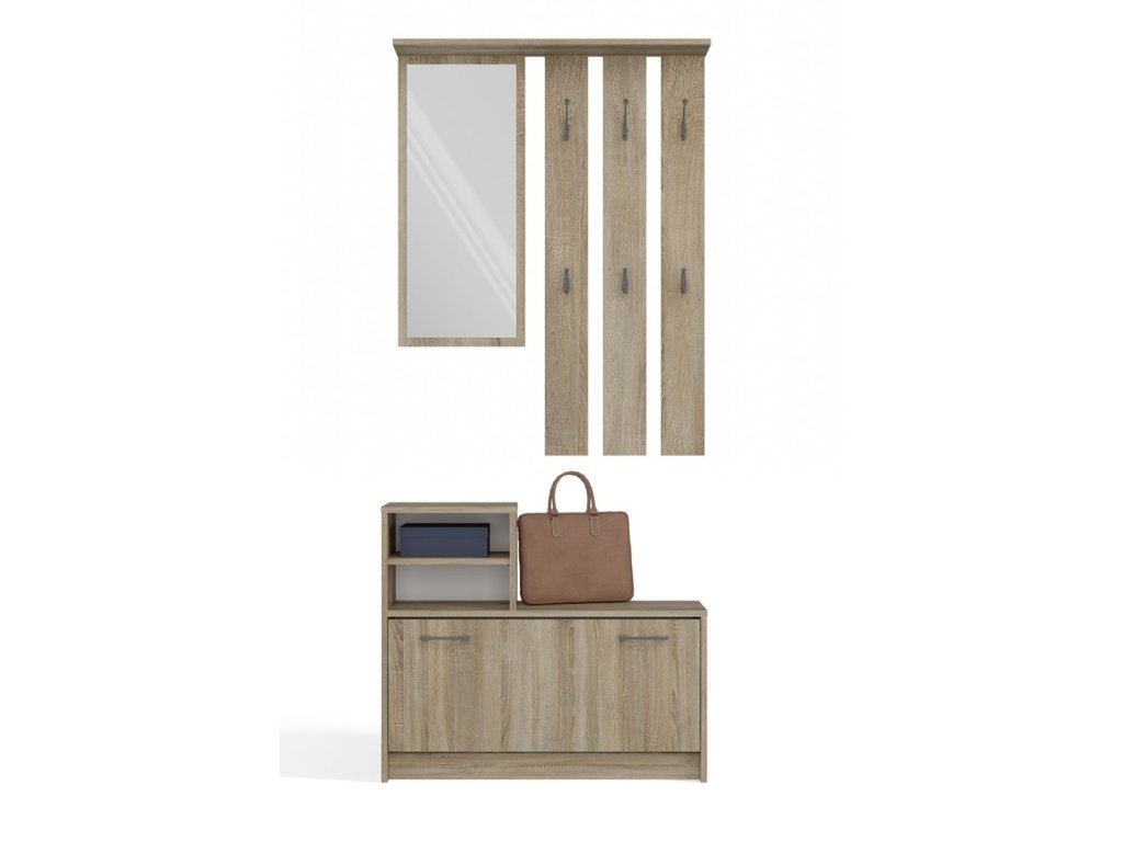 Moderní předsíňová sestava, která vytvoří funkční a pohodlnou předsíň.Hlavní výhody: Botník s podsedákem 6 stylových černých věšáků Praktické zrcadlo s poličkou ...
