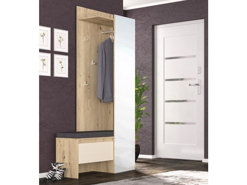 Moderní předsíňová stěna je vyrobena z kvalitní laminátové desky v barevné kombinaci dub artisan/champagne. Součástí stěny je botník se zásuvkou, věšáková stěna s policí a šatní tyčí, která je připevněna k zrcadlu. Polštářek není součástí botníku, nelze doobjednat. Dodáváme v demontovaném stavu.Doplňkové parametry