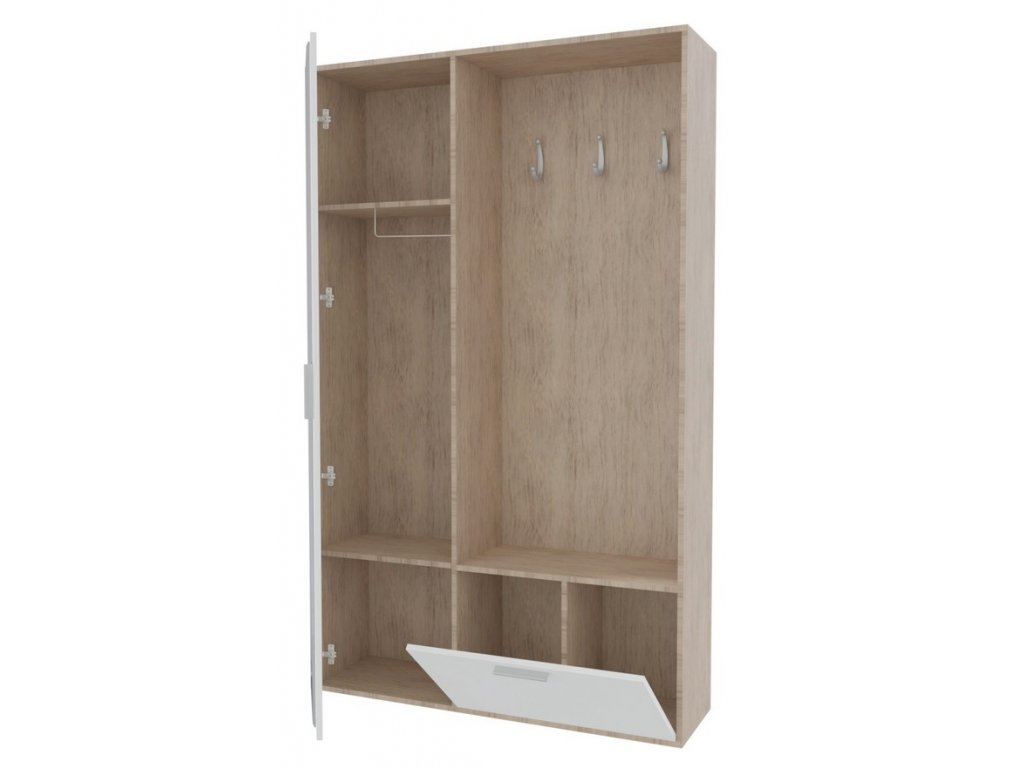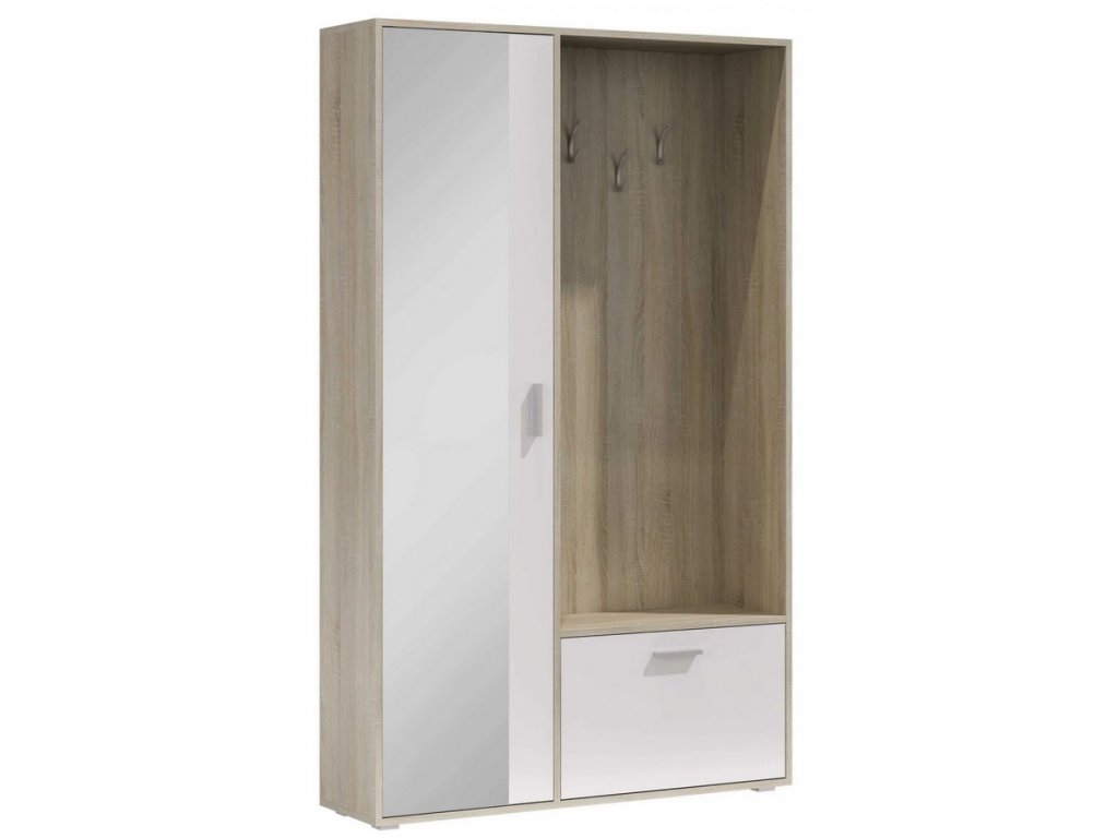 Moderní předsíňová stěna. Je vyrobená z kvalitní laminátové desky 16 mm. Korpus i dvířka jsou v barvě dub sonoma v kombinaci s alpskou bílou. Sestava se skládá z věšákového panelu, výklopného botníku a šatní skříně se zrcadlem ( uvnitř 2 police a šatní tyč ). Dodáváme v demontovaném stavu.Doplňkové parametry