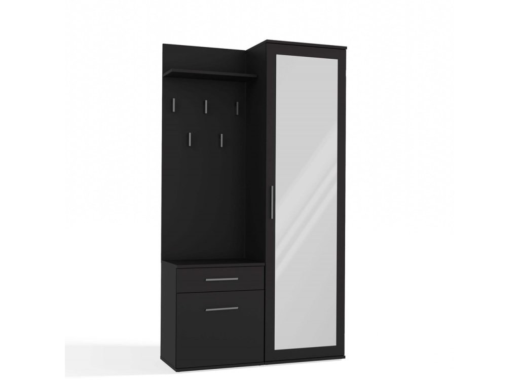 Předsíňová stěna v moderním provedení vytvoří funkční a pohodlnou předsíň. Obsahuje šatní skříň se zrcadlem, 5 věšáků na oblečení s praktickou poličkou a menší skříňku se šuplíkem. Možnost montáže dveří šatní skříně na levou nebo pravou stranu. Vyrobeno z kvalitní LTD desky, která má tloušťku 16 mm a je nenáročná na údržbu. Dodáváme v demontu. V naší další nabídce je možné zakoupit pouze šatní skříň se zrcadlem.