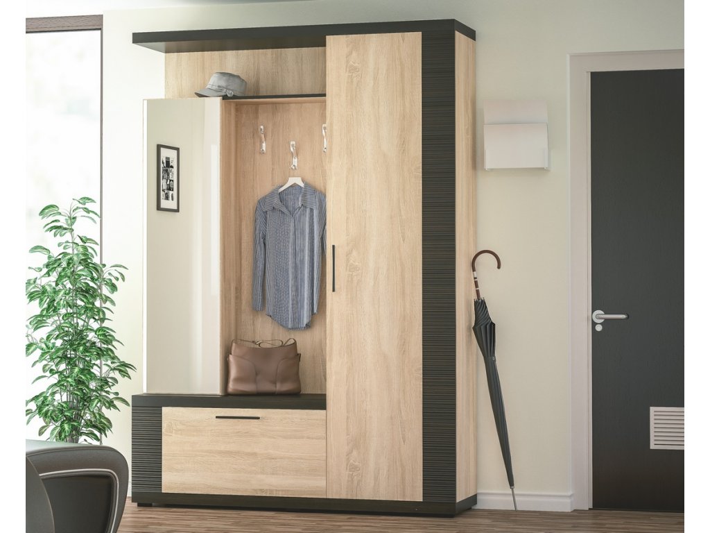 Moderní předsíňová stěna se zrcadlem. Stěna je vyrobena z kvalitní laminátové desky v barevné kombinaci dub sonoma/wenge tmavý. Součástí stěny jsou - skříňka na boty, vysoká skříň, tři věšáky na bundy, police a skřínka s policemi, kde na dveřích je zrcadlo. Dodáváme v demontovaném stavu.Doplňkové parametry