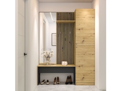 šířka: 97 cm | výška: 195 cm | hloubka: 30 cm Moderní předsíňová stěna. Je vyrobená z kvalitní laminátové desky 16 mm. Korpus i dvířka jsou v barvě dub artisan v kombinaci s...