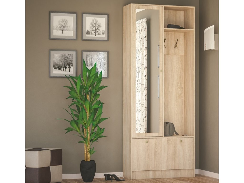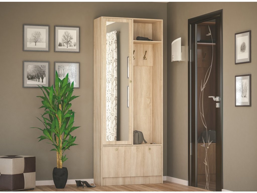 Moderní předsíňová stěna vhodná do menších prostorů. Stěna je vyrobena z kvalitní laminátové desky v barvě dub sonoma. Součástí stěny jsou - skříňka na boty, vysoká skříň, dva věšáky na bundy, polička a na dveřích je zrcadlo. Dodáváme v demontovaném stavu.Doplňkové parametry