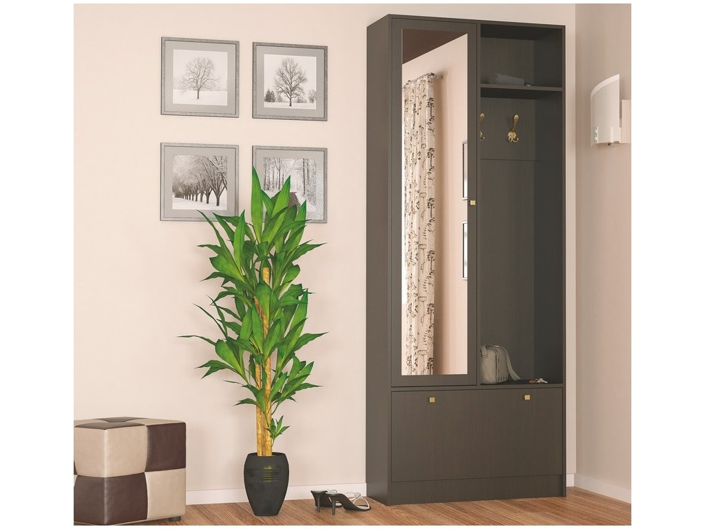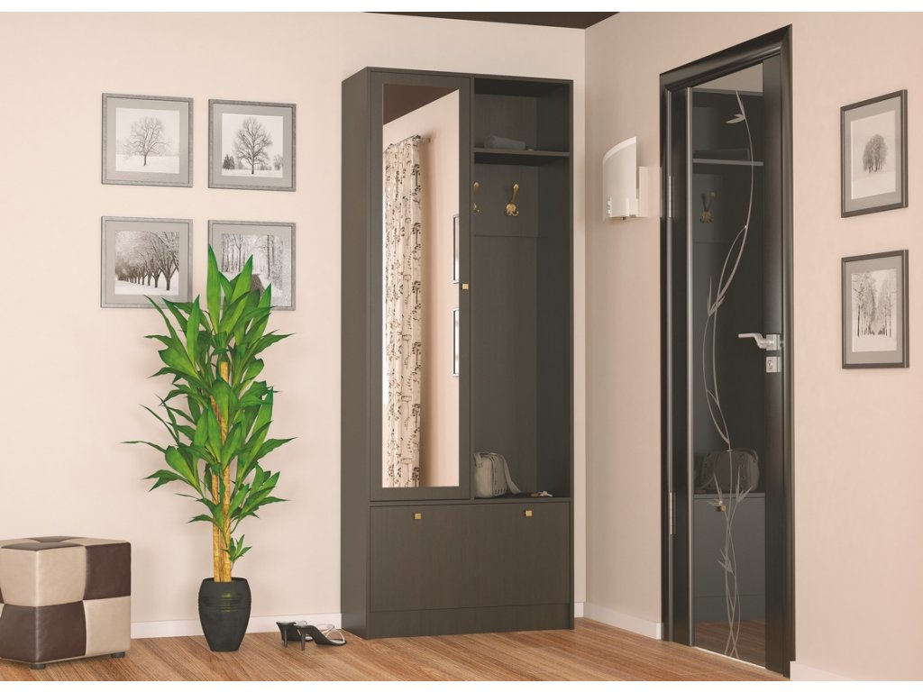 Moderní předsíňová stěna vhodná do menších prostorů. Stěna je vyrobena z kvalitní laminátové desky v barvě wenge tmavý. Součástí stěny jsou - skříňka na boty, vysoká skříň, dva věšáky na bundy, polička a na dveřích je zrcadlo. Dodáváme v demontovaném stavu.Doplňkové parametry