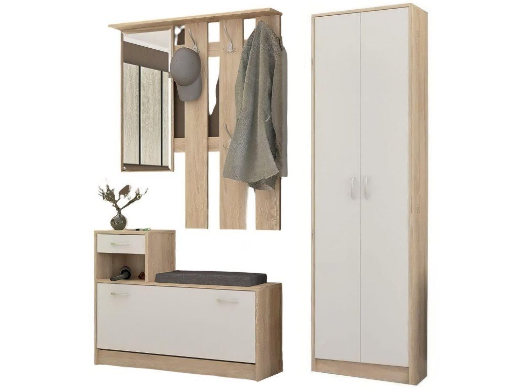Moderní předsíňová stěna se zrcadlem a skříní. Stěna je vyrobena z kvalitní laminátové desky v barevné kombinaci dub sonoma/bílá mat. Součástí stěny je věšáková stěna se zrcadlem a poličkou a malý výklopný botník s policí a zásuvkou (100x187x27,5 cm), šatní skříň (55,3x191x27,5 cm) a podsedákem (65x2x28 cm). Jednotlivé díli lze zakoupit zvlašť. Dodáváme v demontovaném stavu.Doplňkové parametry