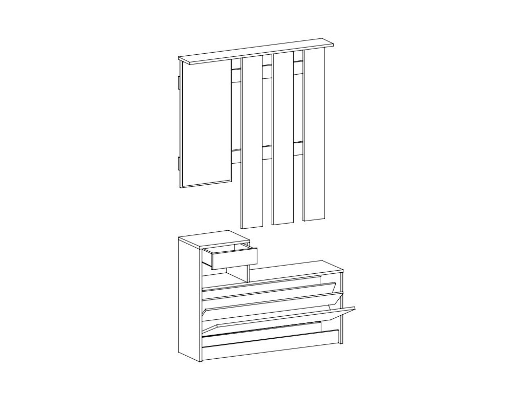 Moderní předsíňová stěna se zrcadlem a skříní. Stěna je vyrobena z kvalitní laminátové desky v barevné kombinaci dub sonoma/bílá mat. Součástí stěny je věšáková stěna se zrcadlem a poličkou a malý výklopný botník s policí a zásuvkou (100x187x27,5 cm) a šatní skříň (55,3x191x27,5 cm). Jednotlivé díli lze zakoupit zvlašť. Dodáváme v demontovaném stavu.Doplňkové parametry
