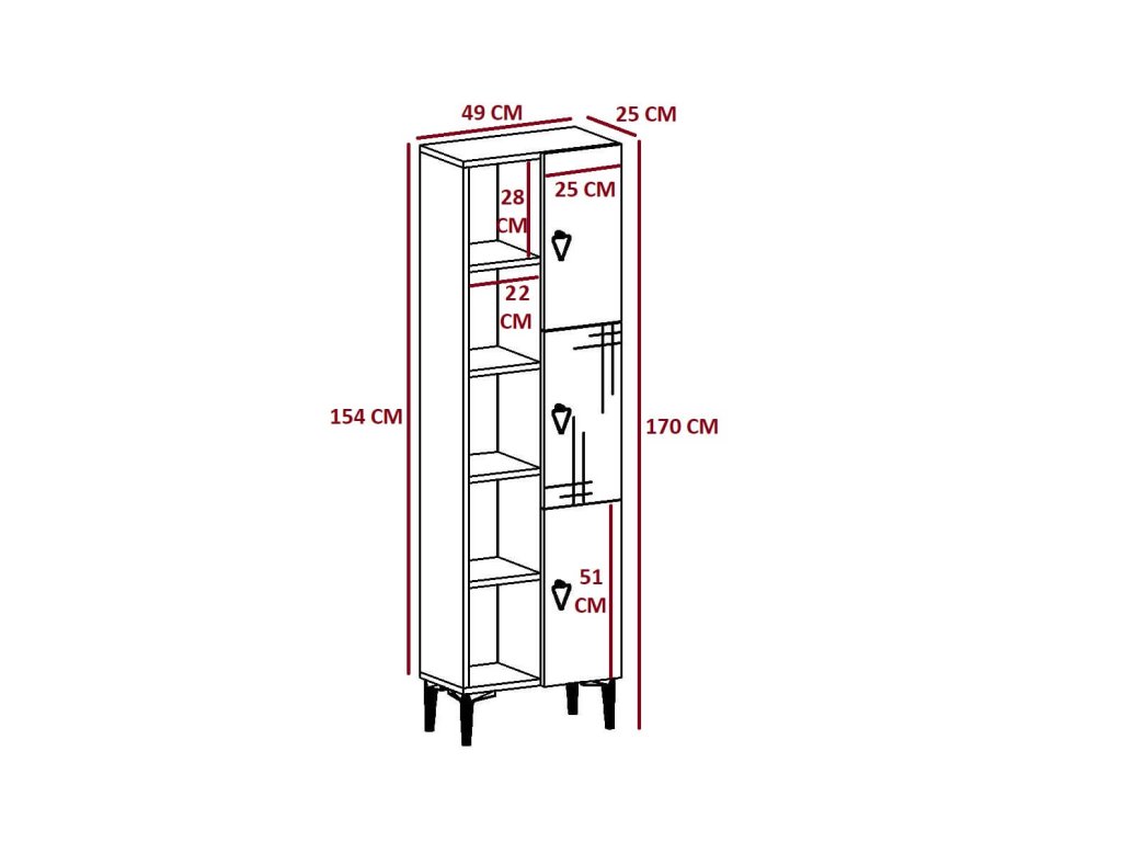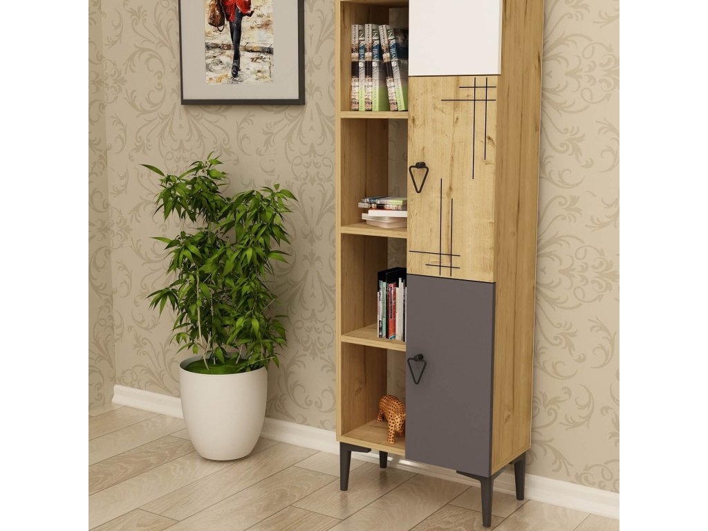Knihovna je dokonalým spojením funkčnosti a moderního designu. Je ideální pro obývací pokoj, kde nabídne dostatek úložného prostoru díky třem plným dvířkům a čtyřem policím. Její kombinace barev a čisté linie dodají vašemu interiéru elegantní a moderní vzhled.
