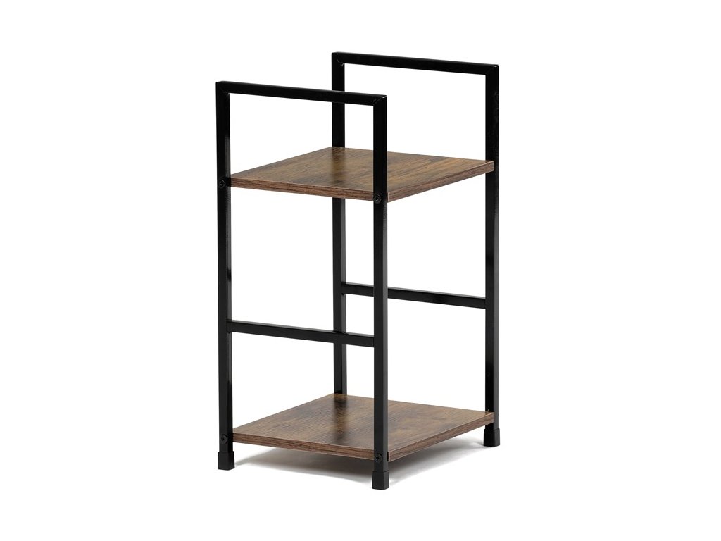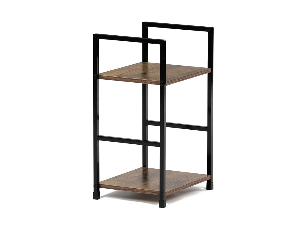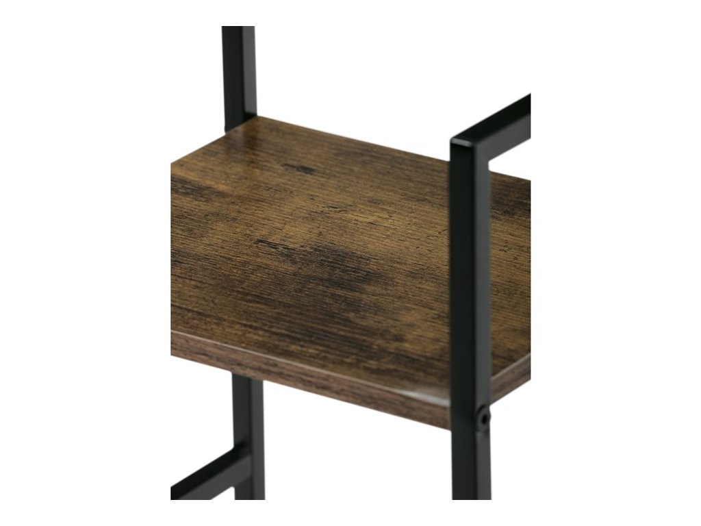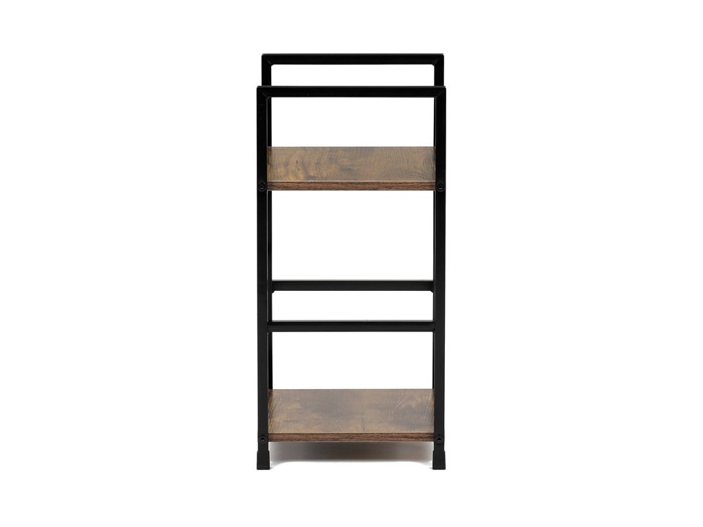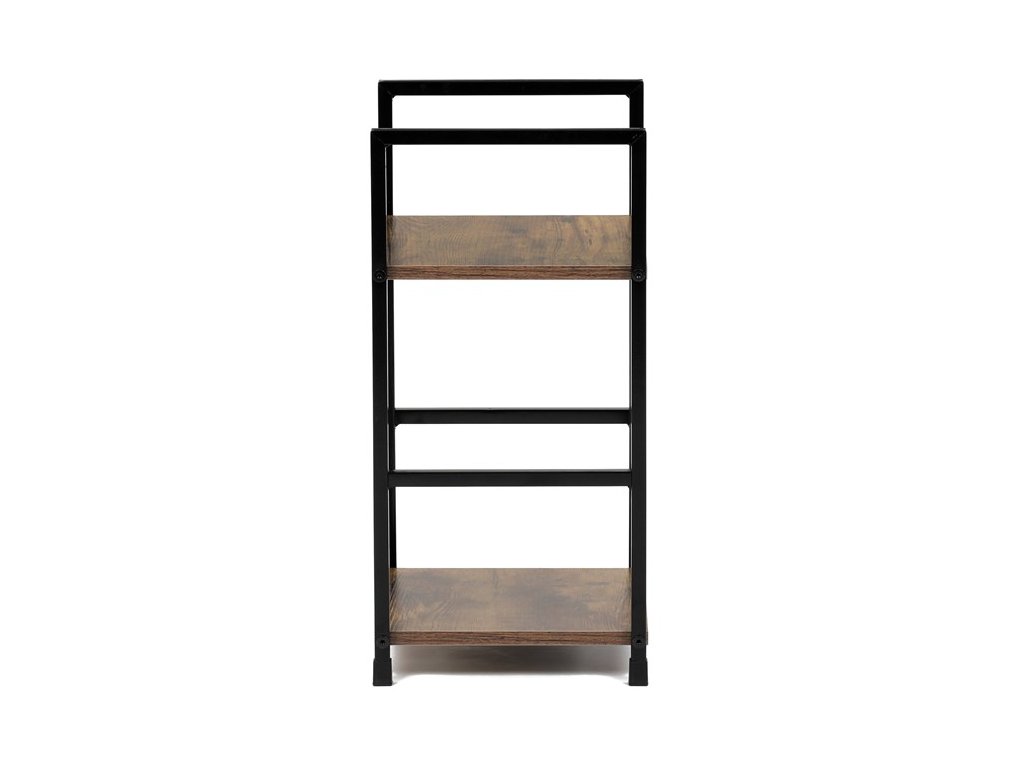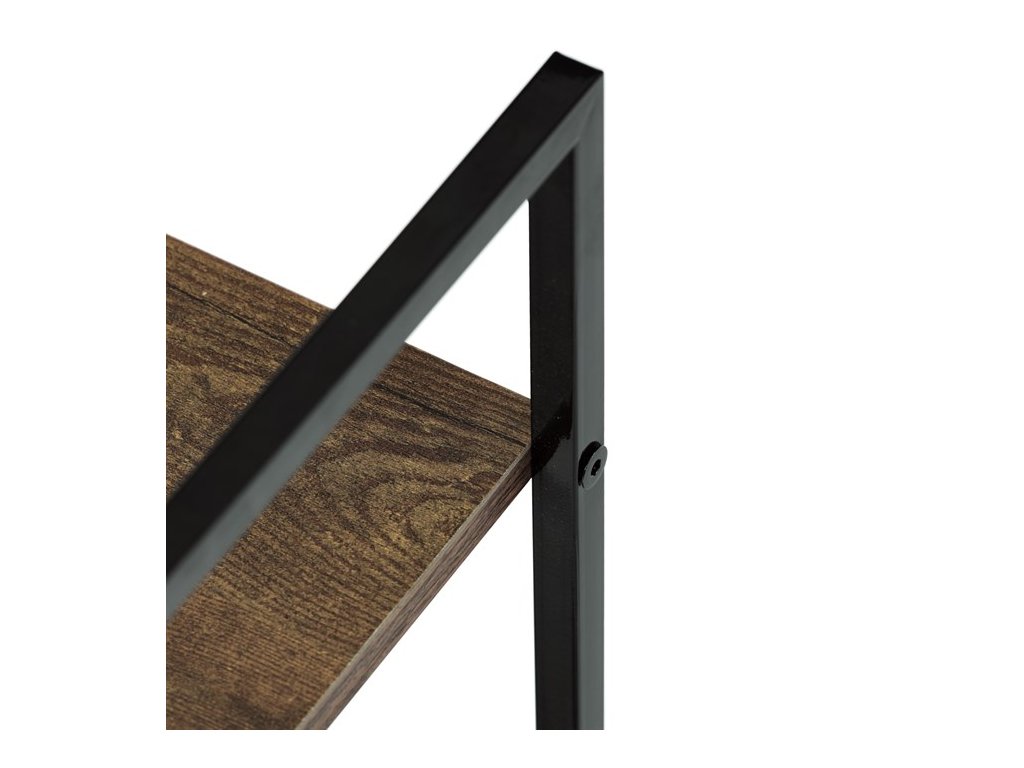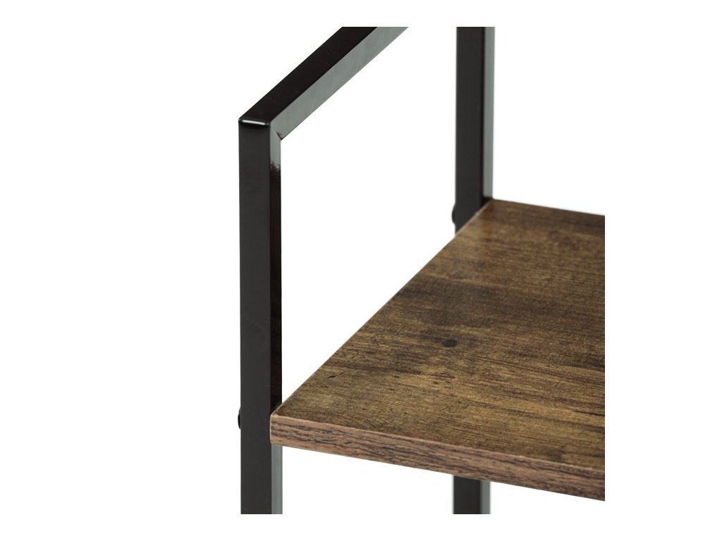 Odlehčený policový regál. Kostra vyrobena z kovových hranatých profilů černé barvy. Na police je použita MDF deska s povrchovou úpravou 3D folie v textuře dubu. Balení obsahuje sadu umožňující připevnění ke stěně.