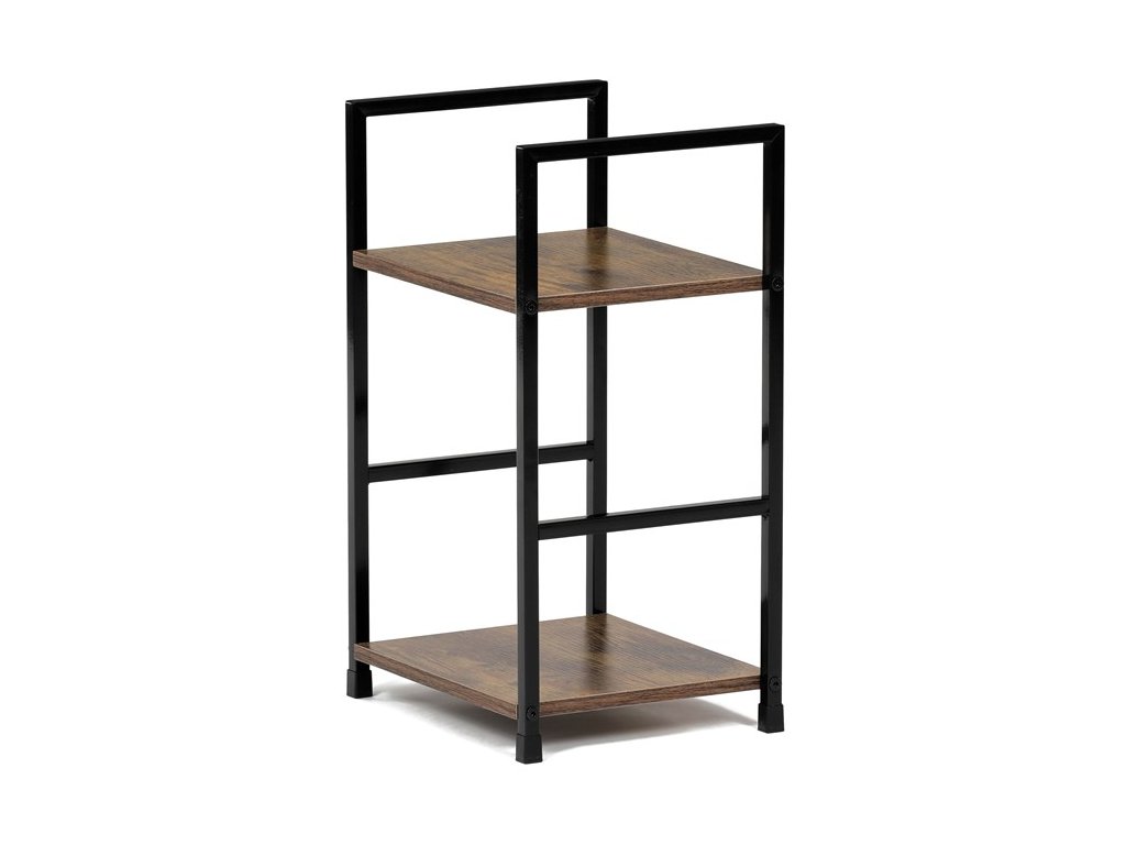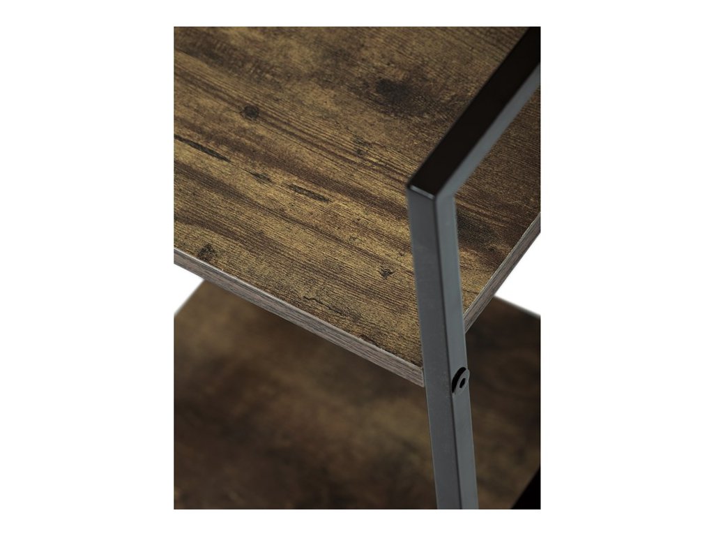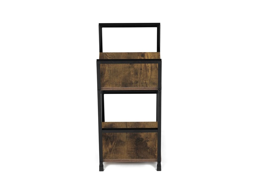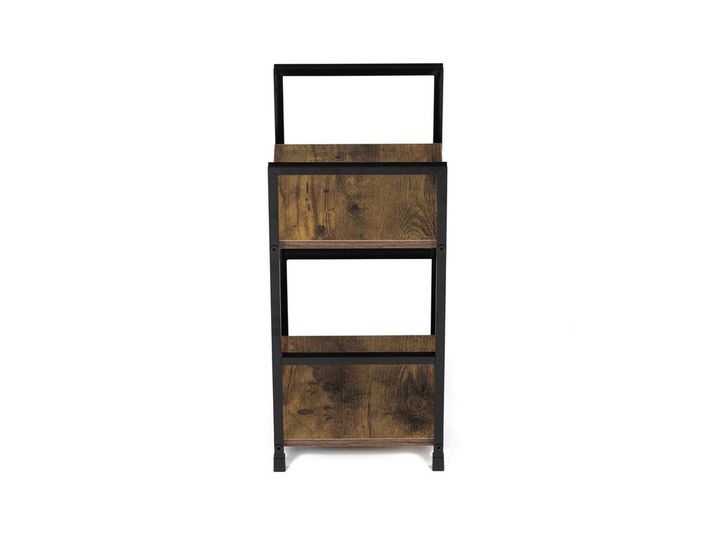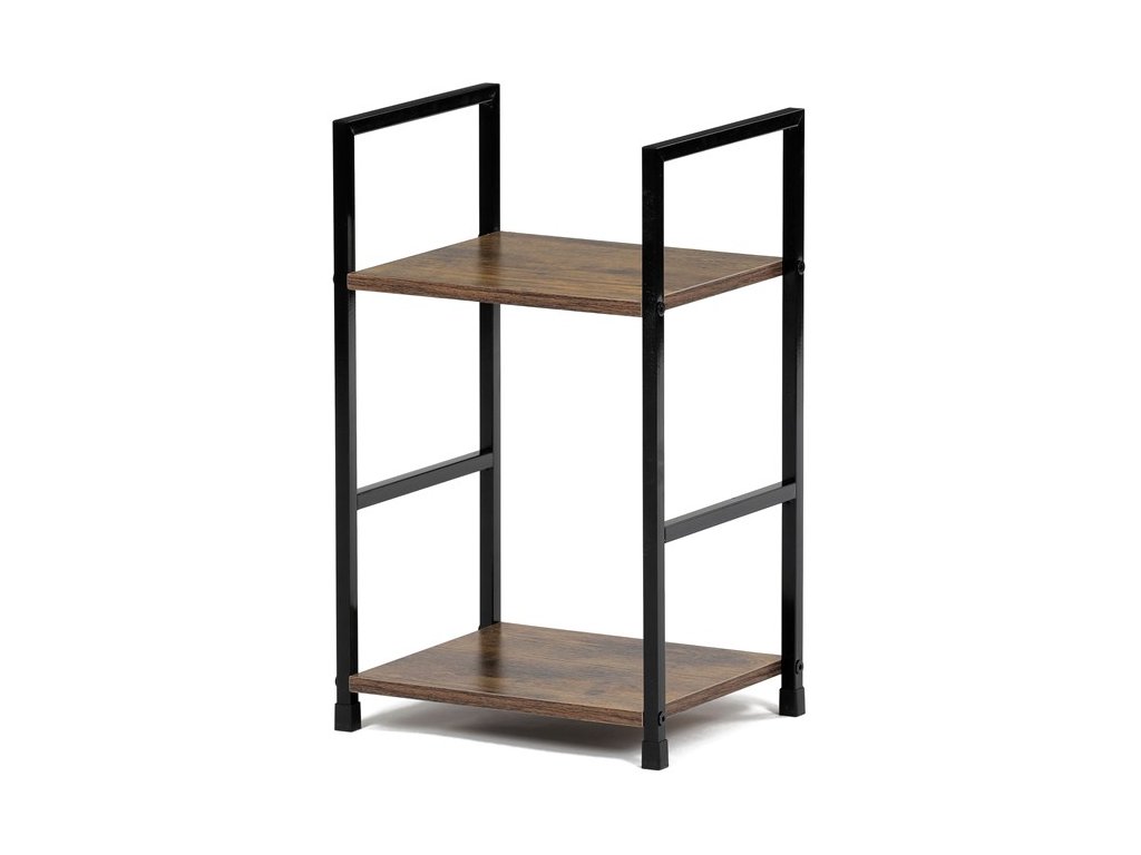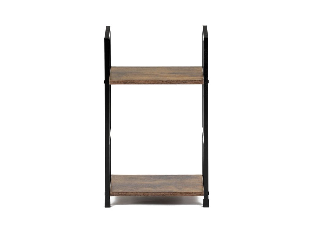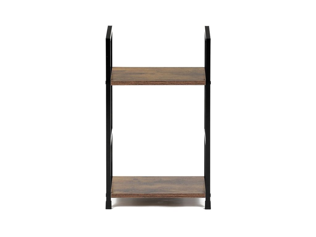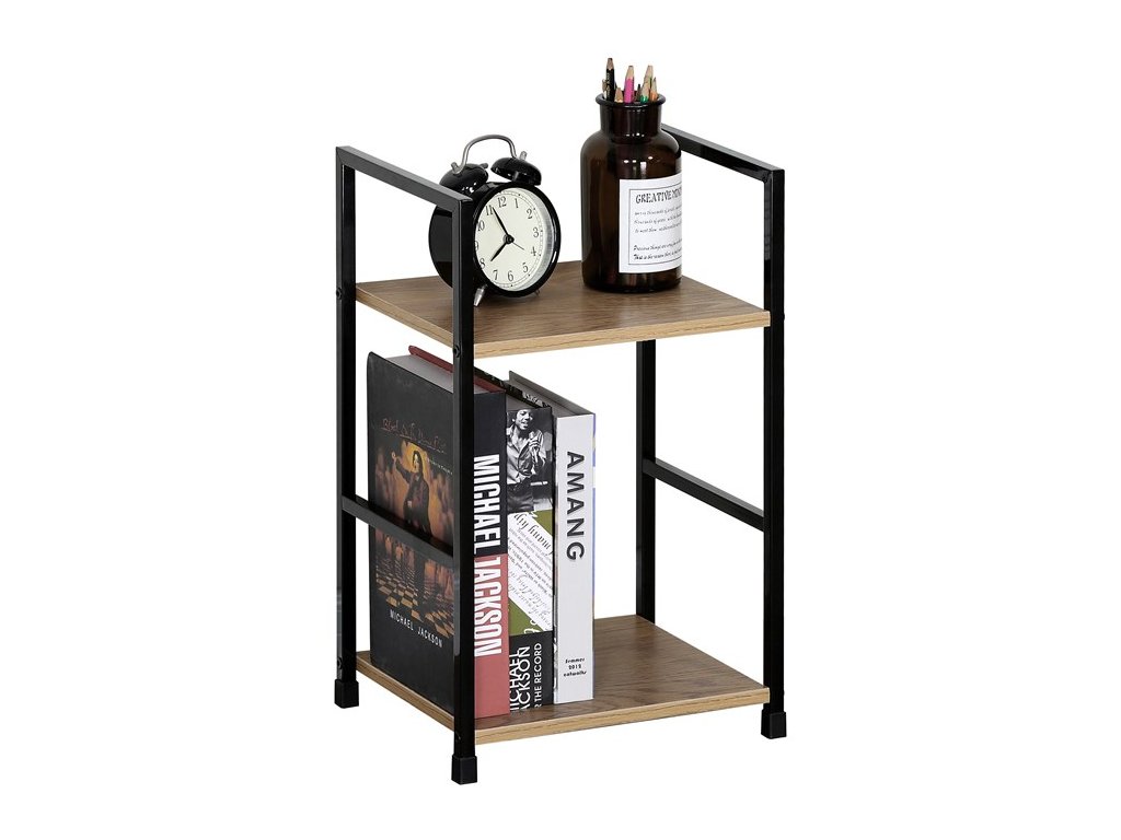 Odlehčený policový regál. Kostra vyrobena z kovových hranatých profilů černé barvy. Na police je použita MDF deska s povrchovou úpravou 3D folie v textuře dubu. Balení obsahuje sadu umožňující připevnění ke stěně.