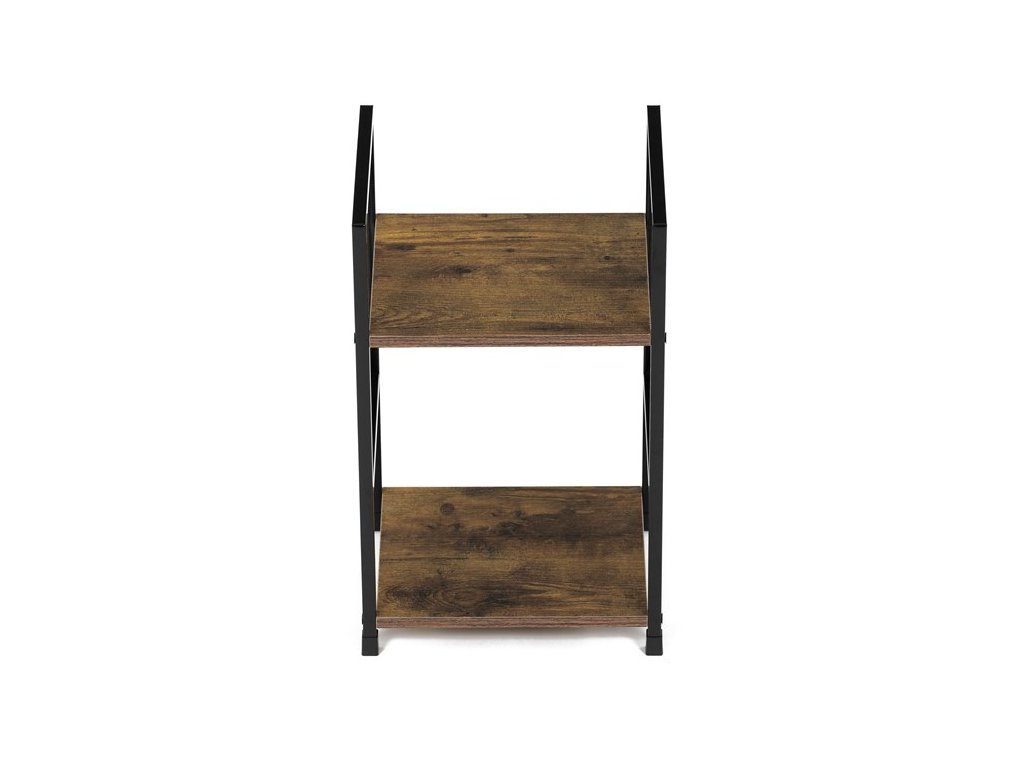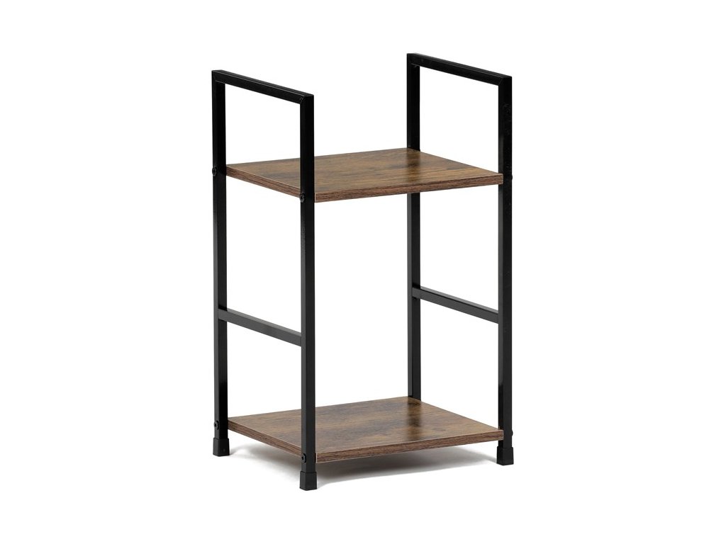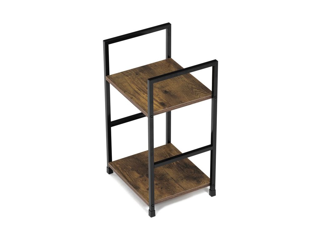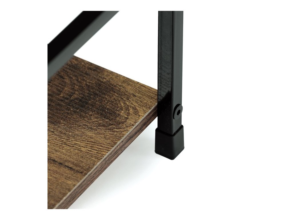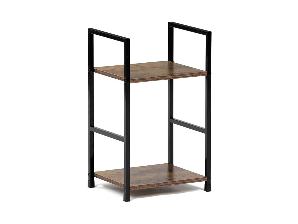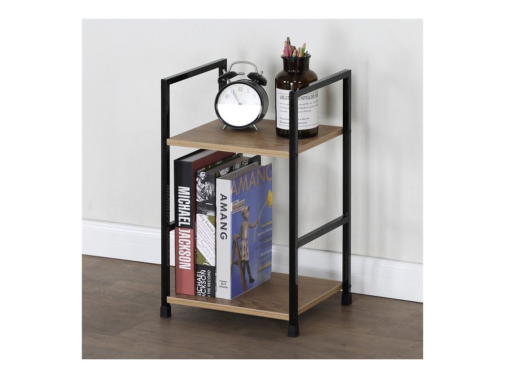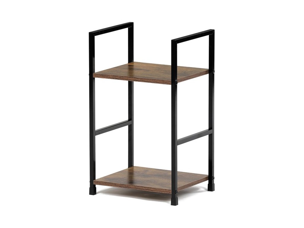 Odlehčený policový regál. Kostra vyrobena z kovových hranatých profilů černé barvy. Na police je použita MDF deska s povrchovou úpravou 3D folie v textuře dubu. Balení obsahuje sadu umožňující připevnění ke stěně.