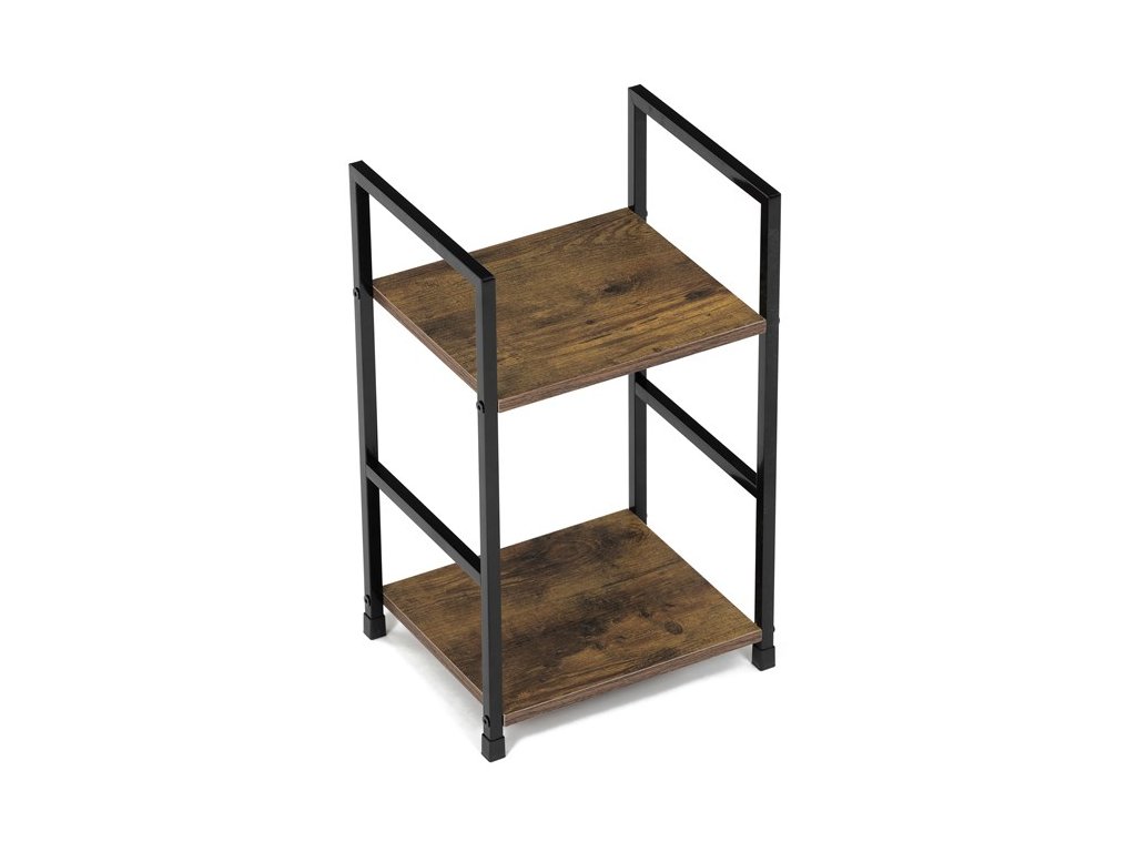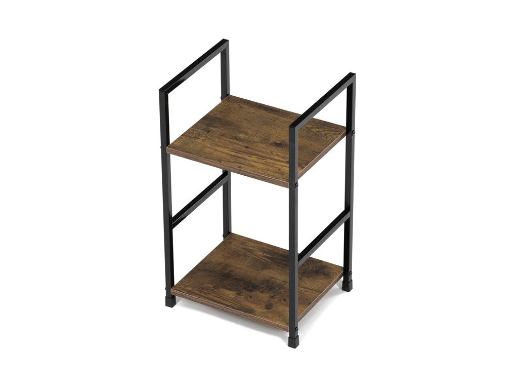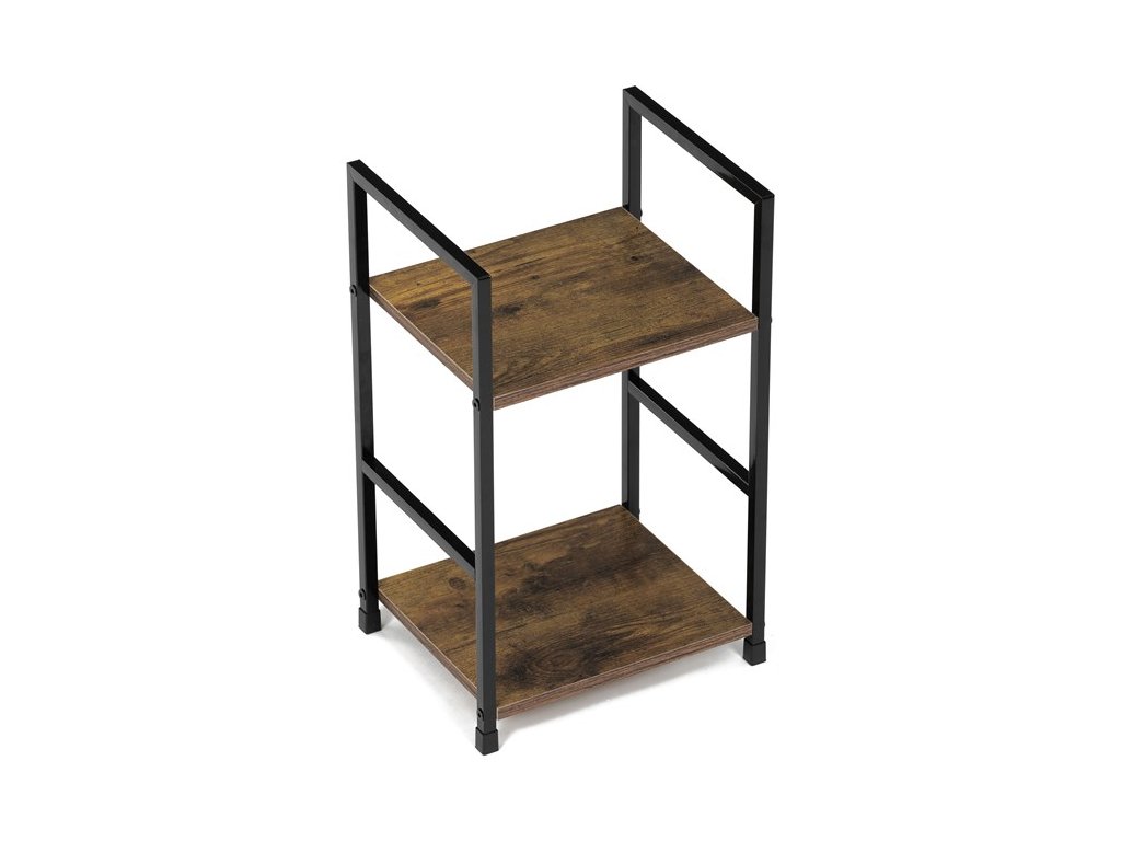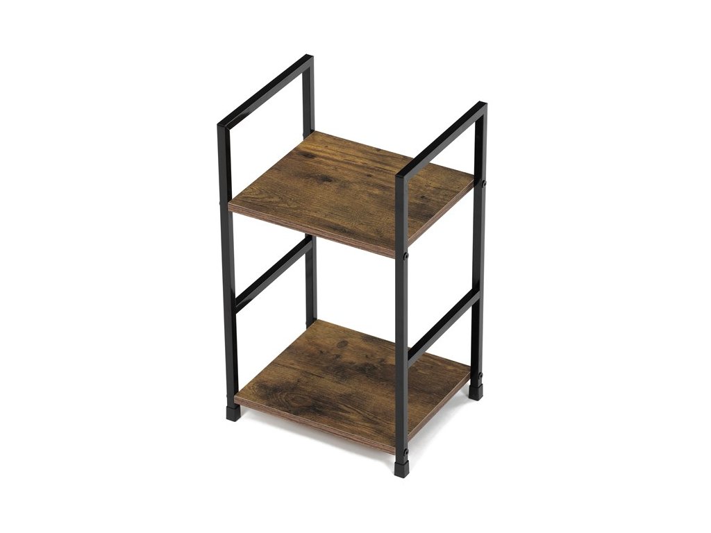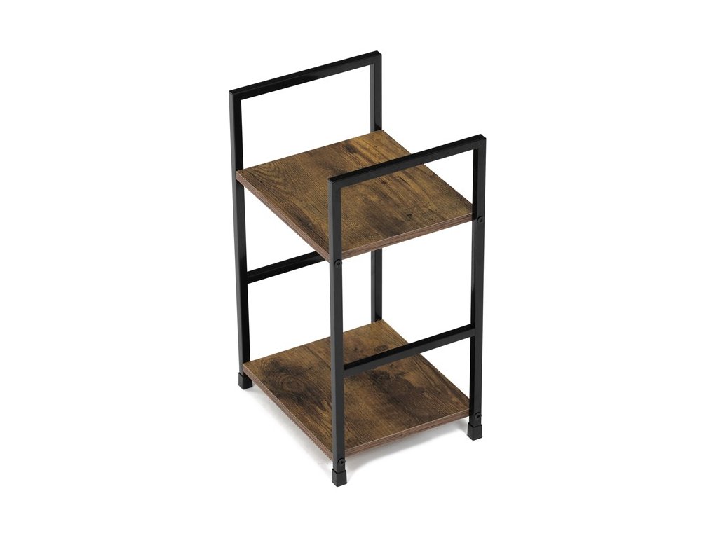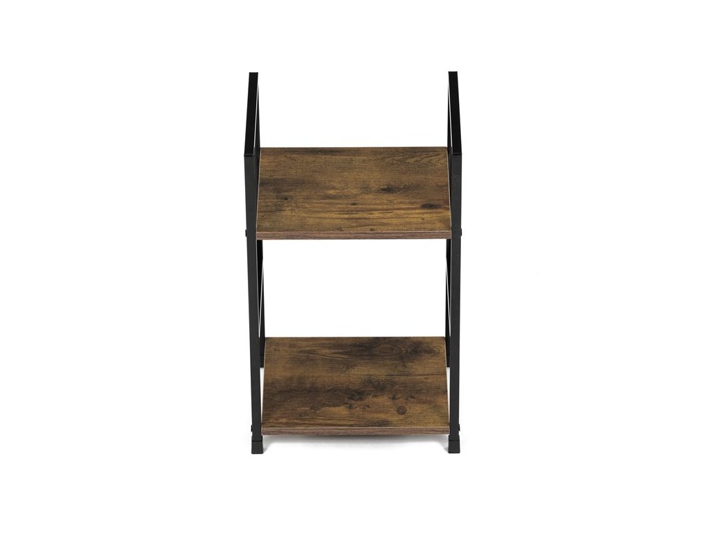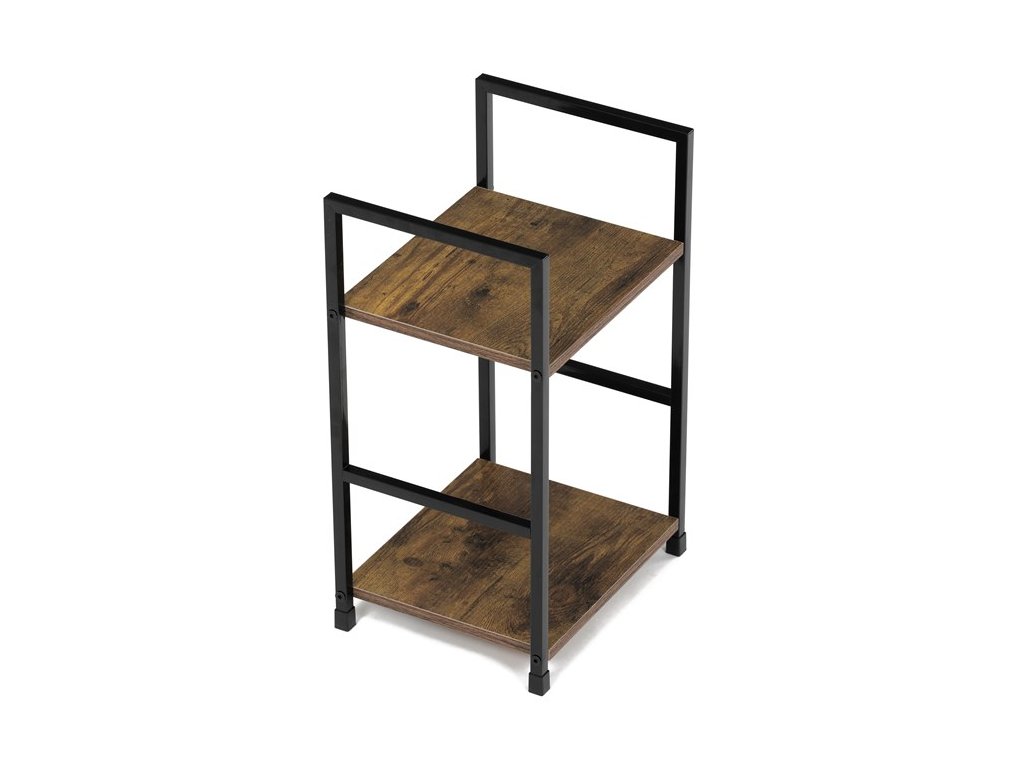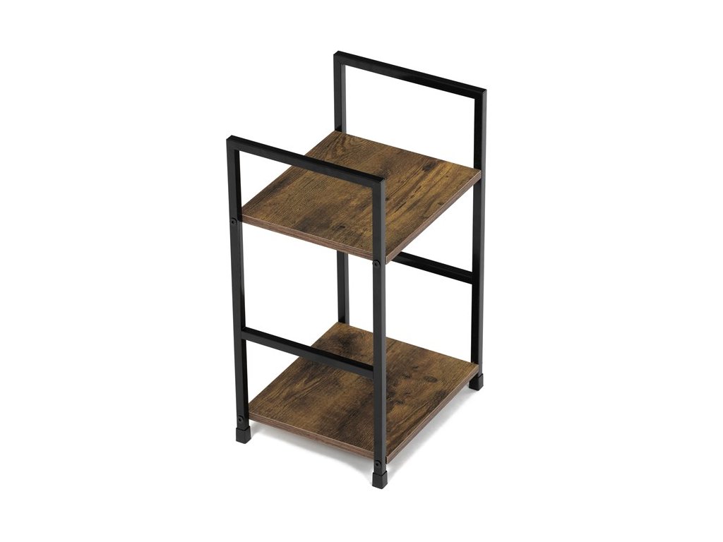 Odlehčený policový regál. Kostra vyrobena z kovových hranatých profilů černé barvy. Na police je použita MDF deska s povrchovou úpravou 3D folie v textuře dubu. Balení obsahuje sadu umožňující připevnění ke stěně.