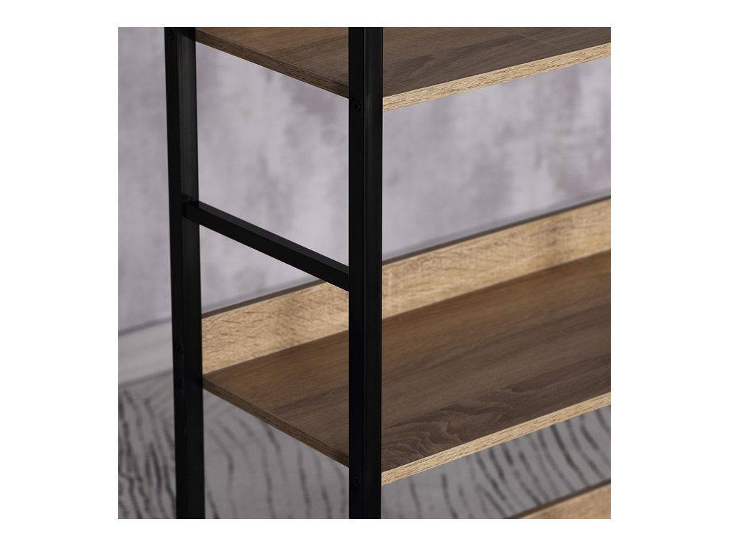 Policový regál má kovovou kostru v práškové černé barvě. Policové díly jsou zhotoven z MDF desky s povrchem 3D folie v odstínu dub sonoma. Zároveň mají na zadní hraně praktické čílko proti zapadnutí vystavených věcí. Pro perfektní rovinu je regál v nožkách zakončen aretační paticí.