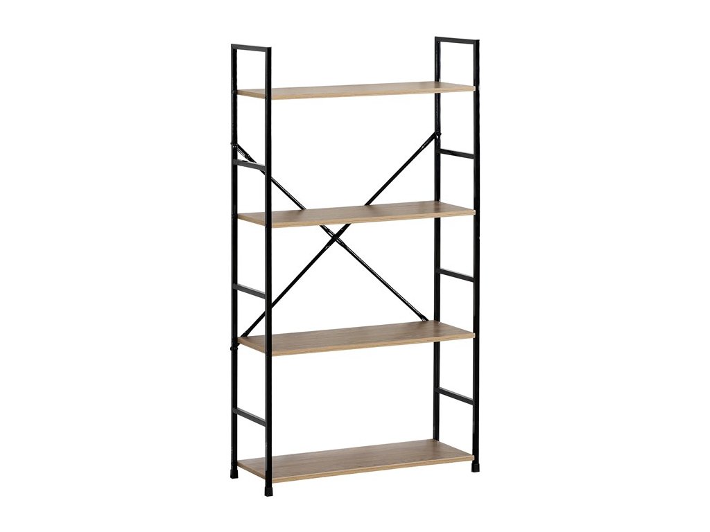 Odlehčený policový regál. Kostra vyrobena z kovových hranatých profilů černé barvy. Na police je použita MDF deska s povrchovou úpravou 3D folie v textuře dubu. Pro lepší stabilitu je na zadní straně kovová výztuha ve tvaru písmene X. Balení obsahuje sadu umožňující připevnění ke stěně.
