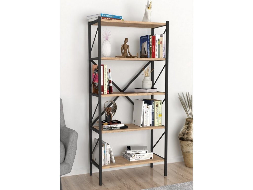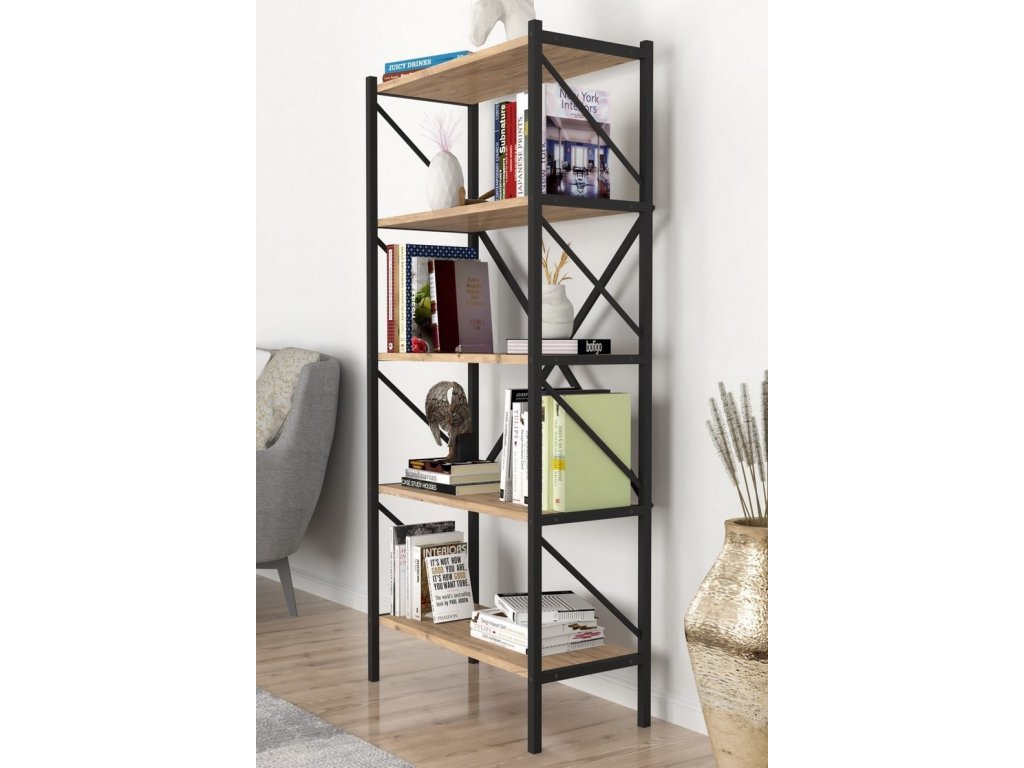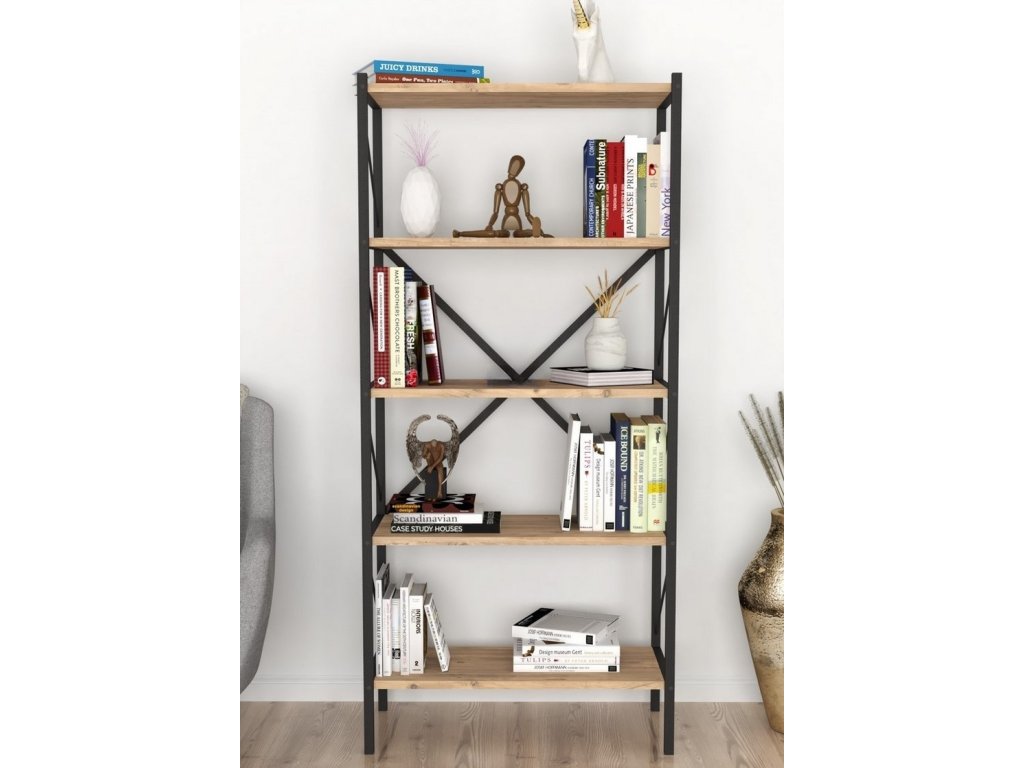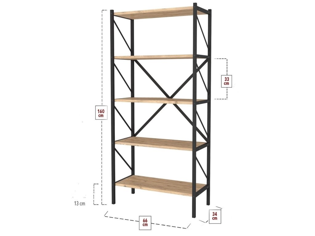 šířka: 66 cm | výška: 121 cm | hloubka: 34 cm Regál se čtyřmi policemi je z kovového rámu v matné černé barvě a police jsou vyrobeny z kvalitní LTD desky v barvě borovice....