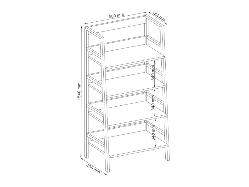 Jednoduchý, ale praktický regál s pěti poličkami. Zajímavá konstrukce nožek je ve tvaru žebříku. Konstrukce je kovová v bílé barvě, deska z kvalitního MDF v barvě dub. Vhodný i pro menší pokoje.Doplňkové parametry