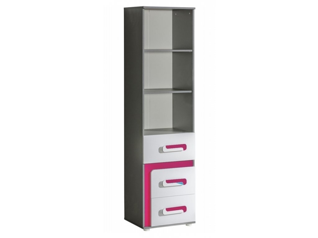 Regál APETTITA ze sektorové řady, která se vyznačuje netradičním zpracováním barev a originalitou úchytů. Tento styl nábytku zaujme každou mladší generaci. Nábytek je vyroben z kvalitní LTD desky hraněné ABS lištou. Korpus je v barvě šedá antracit, čela zásuvek jsou bílé matné, doplňková barva je růžová. Úchytky jsou v barevné kombinaci růžová/bílá. Sektorový nábytek APETTITA má široký výběr prvků, který Vám zaručí sestavit si dětský nebo studentský pokoj, ložnici či kancelář podle svých potřeb, přání a představ. Dodáváme v demontovaném stavu.Doplňkové parametry