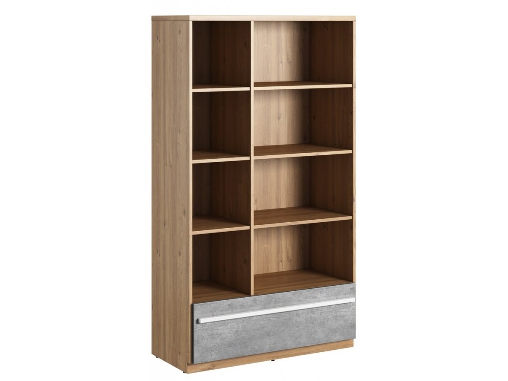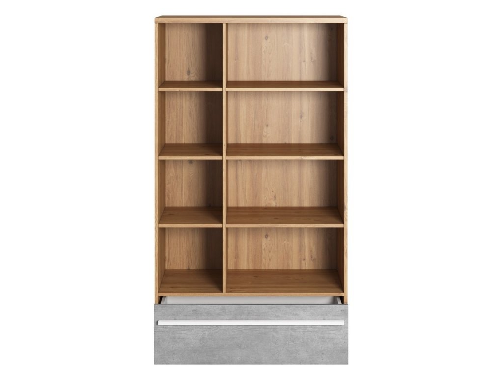 Regál se zásuvkou v moderním stylu. Korpus je vyroben z desky LTD v barvě dub nash, čelo zásuvky je vyrobeno z desky LTD v barvě šedá. Dodáváme v demontovaném stavu.Doplňkové parametry