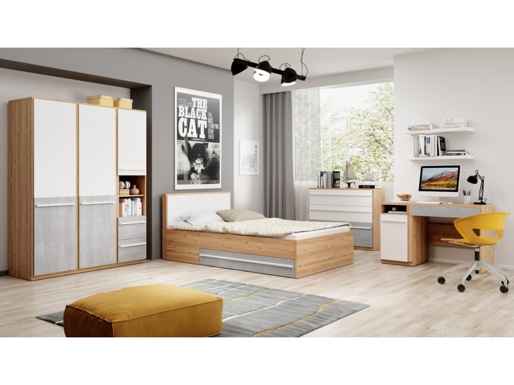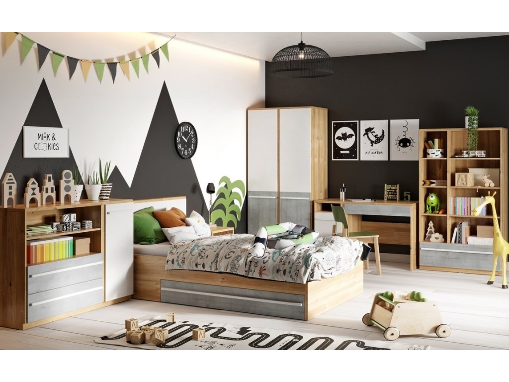 Sestava dětského pokoje v moderním stylu. Korpus je vyroben z desky LTD v barvě dub nash, dvířka a zásuvky jsou vyrobeny z desky LTD v kombinaci barev šedá/bílá. Sestava se...